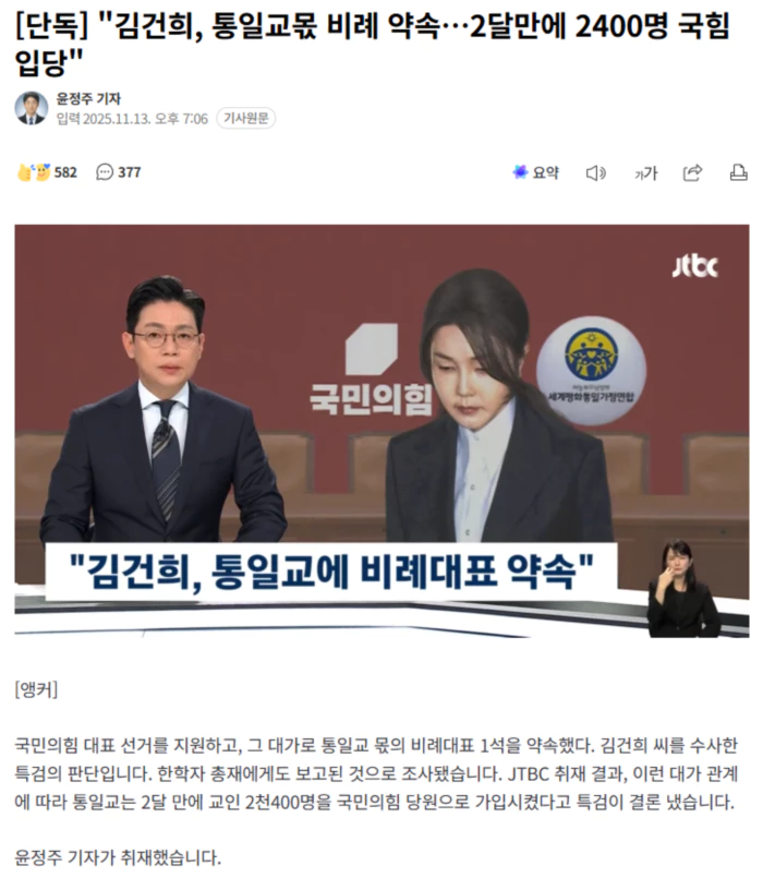 [기자] 특검은 김건희씨가 국회의원 비례대표를 대가로 통일교의 당원 가입에 개입했다고 판단했습니다. 취재결과, 김건희씨의 정당법 위반 혐의 공소장에 그 과정을 구체적으로 담았습니다. "통일교 윤영호 전 본부장이 '김건희씨가 당대표 선거를 도와달라'고 했다는 것과 '김건희씨가 비례대표 1석을 통일교 몫으로 약속하겠다고 했다'는 내용을 한학자 총재에게 보고했다"고 적었습니다. 김건희씨는 특검 조사를 받으며 자신을 낮췄지만, [김건희/지난 8월 6일 : 저같이 아무것도 아닌 사람이 이렇게 심려를 끼쳐 진심으로 죄송합니다.] 특검 수사대로라면 아무런 권한이 없는 김건희씨가 국회의원 공천을 내세워 종교가 정치에 개입하도록 길을 튼 셈입니다. 통일교 측과 김건희씨의 연결고리는 건진법사 전성배씨였습니다. 김건희씨 입장이 전씨와 윤 전 본부장을 통해 한학자 총재에 전달됐고 한 총재 승인에 따라 통일교가 신도들을 국민의힘 당원으로 가입시킨 것으로 조사됐습니다. 당원 가입은 '친윤' 권성동 의원의 당대표 선거를 지원하기 위한 것으로 특검은 판단했습니다. 통일교 입장에선 권 의원이 당대표가 되면 비례대표 한 자리를 받을 수 있다고 생각했다는 겁니다. .. 후략 ..