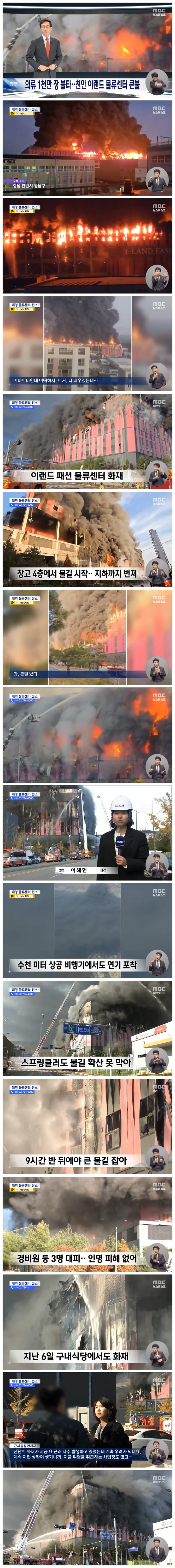 오늘(11/15) 새벽 충남 천안에 있는 이랜드 패션 물류센터에서 불이 나 9시간 반 만에 큰 불길을 잡았습니다.
