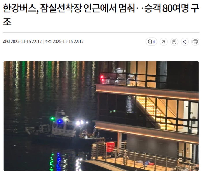 | 한강버스, 얕은 곳 강바닥 걸려 멈춰.. 승객 82명 전원구조 (0) | 2025.11.16 |