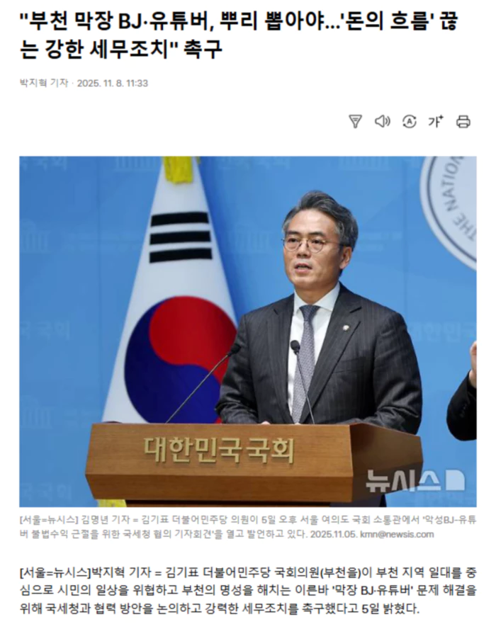 김 의원은 최근 국세청 관계자들과의 협의 자리에서 "부천시와 경찰이 현장 단속과 수사로 핵심 관련자들을 구속하는 등 가시적 성과를 내고 있으나, 재발 방지를 위해서는 '돈의 흐름'을 끊는 근본적 조치가 필요하다"라며 이같이 강조했다. 또 ▲시민의 일상을 침해하며 수익을 올리는 BJ·유튜버에 대한 전면 실태 점검 ▲누락 소득에 대한 강력한 세무조치를 요구했다. 국세청은 "관련 수익 구조를 면밀히 들여다보고 엄정히 조치하겠다"라며 적극적인 의사를 밝혔다. 인천지방국세청 역시 '부천 지역 고위험 BJ·유튜버 명단을 수집해 집중 검증에 착수하겠다'라고 응했다. 김 의원은 "표현의 자유는 민주사회의 근간이지만, 시민의 일상을 짓밟는 폭언과 난동은 결코 보호받을 수 있는 표현이 아니다"라며 "시민의 일상을 위협하며 지역 상권을 파괴하는 불법행위로 벌어들인 돈은 끝까지 추적해 그 책임을 물어야 한다"라고 강조했다. .. 후략 ..