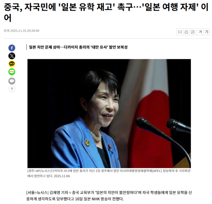 중국 교육부는 이날 홈페이지에 이같이 일본 유학에 관한 주의 환기의 통지를 게재했다. 일본의 다카이치 사나에 총리가 중국의 대 대만 무력행사 시 일본도 존립위기 의식으로 무력 개입을 할 수 있다고 시사한 소위 '대만 유사' 국회 발언 후 강하게 반발하고 있는 중국의 일본 '때리기' 일환으로 여겨진다. NHK는 중국 당국이 일본 유학을 계획 예정하고 있는 학생이나 이미 일본에 있는 중국인 유학생에게 '일본 현지의 치안 정세에 주의해 방범 의식을 높일 것을 촉구한다'고 한 뒤 나아가 '일본 유학을 신중하게 계획하도록 제안한다'고 말했다고 전했다. 현재 일본에 유학하고 있는 중국인은 지난해 12만 3000여 명으로 1년 전보다 8000명 정도 늘었다. 일본 내 해외 유학생 중 중국 출신이 가장 많다. 앞서 중국 외교부는 14일 중국인들에게 일본으로 여행가는 것을 삼갈 것을 권고했다. 외교부는 밤 늦게 SNS로 '중국 국민은 당분간 일본에 가는 것을 피하고 동시에 일본에 이미 가 있는 중국 국민은 현지 치안 정세에 주의해서 자신을 지키도록 할 것을 엄중하게 주의 환기한다'고 말했다. .. 후략 ..