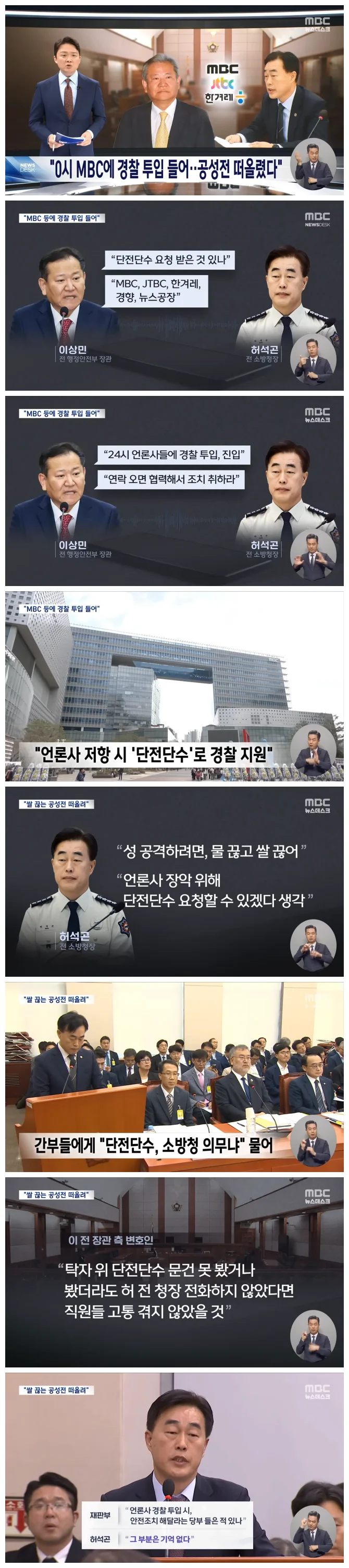 비상계엄 당시 이상민 전 행안부 장관으로부터 MBC 등 언론사 단전단수 지시를 받았다고 증언한 허석곤 전 소방청장이, 이뿐만 아니라 그날 자정에 언론사들로 경찰이 투입된다며 이들과 협력해서 조치를 취하란 지시까지 받았다고 추가로 증언했습니다.
