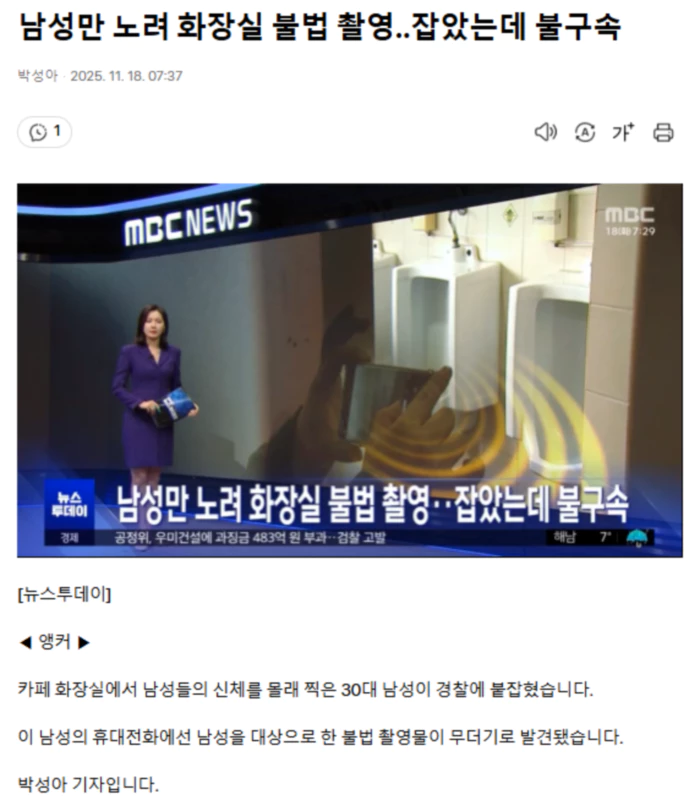 ◀ 리포트 ▶ 지난 11일 경북 포항에 사는 20대 남성 세 명은 동네의 한 카페에서 공부하다 화장실에 갔습니다. 그러자 옆자리에 있던 한 남성이 곧바로 화장실에 뒤따라 들어오더니 수상한 행동을 반복했습니다. [이재근/피해자] "누가 봐도 전화하는 건 아니고 저를 찍는 듯한 느낌을 계속 받았어요. 그래서 이렇게 쳐다보면 핸드폰을 이렇게 치우고…" 이들이 '뭐 하는 거냐'라고 묻자 남성은 도주를 시도했고, 이들은 남성을 붙잡아 남성의 휴대전화를 확인했습니다. 휴대전화 사진첩엔 불법촬영한 것으로 보이는 사진과 동영상들이 가득했습니다. [조의겸/피해자] "살짝 이렇게만 봐도 살색이 많은 그런 사진들이 너무 많아서 '아, 이거 우리만 있는 게 아니구나'…" 신고를 받고 출동한 경찰은 이 남성을 현장에서 긴급체포했습니다. 38살인 이 남성은 장애인 사회복지사로, 휴대전화에선 수백 장의 불법 촬영물들이 발견됐습니다. 약 1년간 남성들의 신체를 몰래 찍은 사진과 동영상들이었습니다. 범행 장소는 주로 도서관과 체육관 등 공중시설의 화장실과 탈의실이었습니다. 경찰은 이 남성에 대한 구속영장을 신청했지만, 검찰은 증거가 이미 확보됐고 초범이라는 이유 등으로 기각했습니다. .. 후략 ..