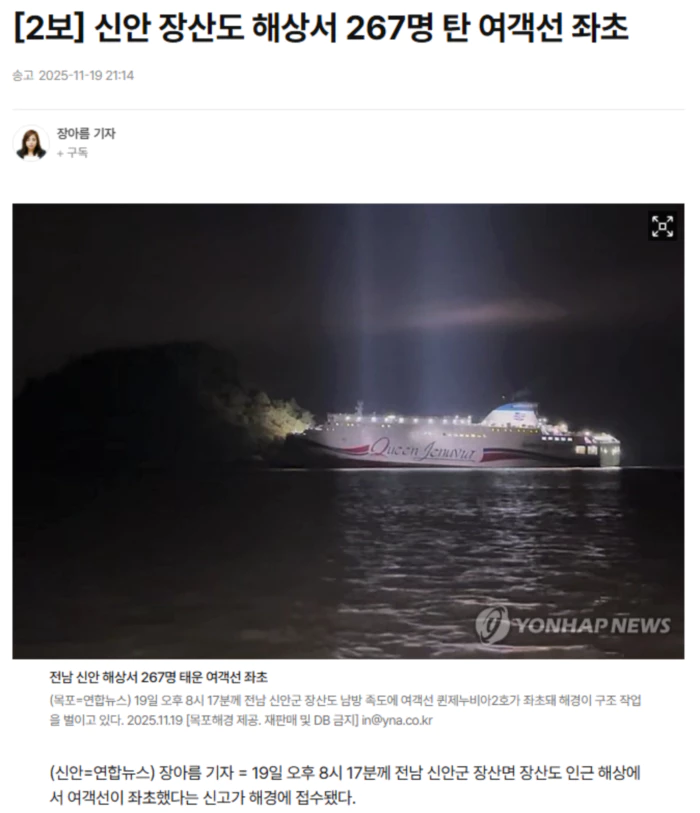 | 신안 해상서 267명 태운 여객선 좌초.. 해경 구조 중 (0) | 2025.11.19 |