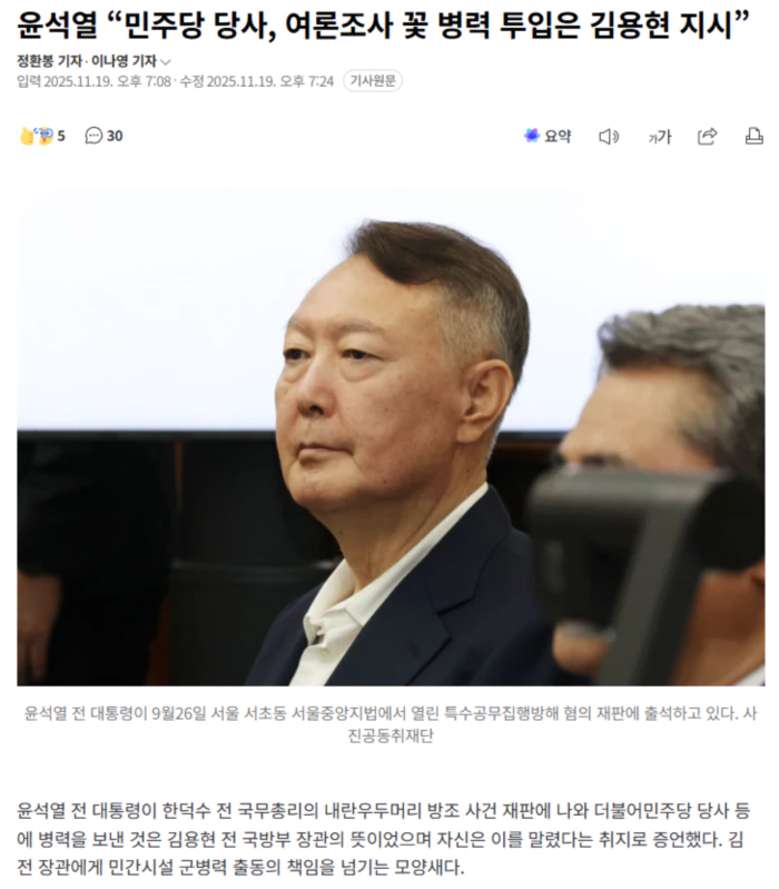 서울중앙지법 형사합의33부(재판장 이진관)의 심리로 19일 열린 한 전 총리의 내란우두머리 방조 사건 재판에 증인으로 출석한 윤석열 전 대통령은 “계엄 선포 뒤 국무위원과 비서실장, 안보실장, 국정원장 다 내보내고 방에 있을 때 시간은 정확히 모르지만 (김용현 전) 국방부 장관에게 전화를 받았다. (김 전 장관이) ‘여론조사 꽃, 무슨 언론사에 병력을 보내야 할 것 같다. 선관위 관련해서 여기도 보내야 할 것 같다’라고 해서 (내가) ‘거긴 민간기관이니까 안 된다. 무슨 군을 여기저기 보내려고 하느냐. 하지 말아라”라고 잘랐다. 그래서 아마 출발한 사람들 올스톱하고 그렇게 된 것으로 안다”라고 말했다. 비상계엄 당시 군은 민주당 당사와 김어준씨가 운영하는 ‘여론조사 꽃’ 등에 병력을 보낸 바 있는데, 윤 전 대통령이 이것이 자신의 지시가 아니었다고 부인한 것이다. 윤 전 대통령은 “(김 전 장관이) 일단 출발하고 나한테 재가를 받으려고 한 거 같다. 제가 절대 안 된다고 하니까 올스톱을 시킨 것”이라고 강조했다. 이날 윤 전 대통령은 내란 사건을 수사하는 조은석 특별검사팀 쪽의 질문에는 대부분 증언을 거부했다. 다만 ‘비상계엄 선포를 들은 (국무회의) 참석자들은 증인(윤 전 대통령)에게 뭐라고 했나’라는 질문에는 “계엄이 자기들의 부처 업무와 관련해서 도움이 안 되고 부정적이라는 그런 이야기를 했던 것으로 기억한다. 다 반대하는 취지로 이야기들을 많이 했다”라고 답변했다. 이어 “지금 기억나는 것은 최상목 기획재정부 장관이 ‘금융시장에 대한 여파는 어떻게 됩니까’ 이런 이야기한 것이 기억난다. 외교부 장관은 우방국이나 동맹국 등 가까운 나라에 우리가 어떻게 대처해야 하는지 그런 취지의 이야기를 했다. 내가 (그 자리에서) 다 이야기할 수는 없지만 마음속으로 오래가지 않고 끝날 계엄이라고 생각했기 때문에 금융시장 걱정마라. 미국이나 일본은 국가안보실 통해 설명할 테니 외교부 장관은 걱정하지 말라는 취지로 이야기했다”라고 말했다. .. 후략 ..