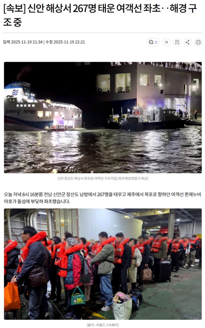 | 신안 장산도 해상서 267명 탄 여객선 좌초 (0) | 2025.11.19 |