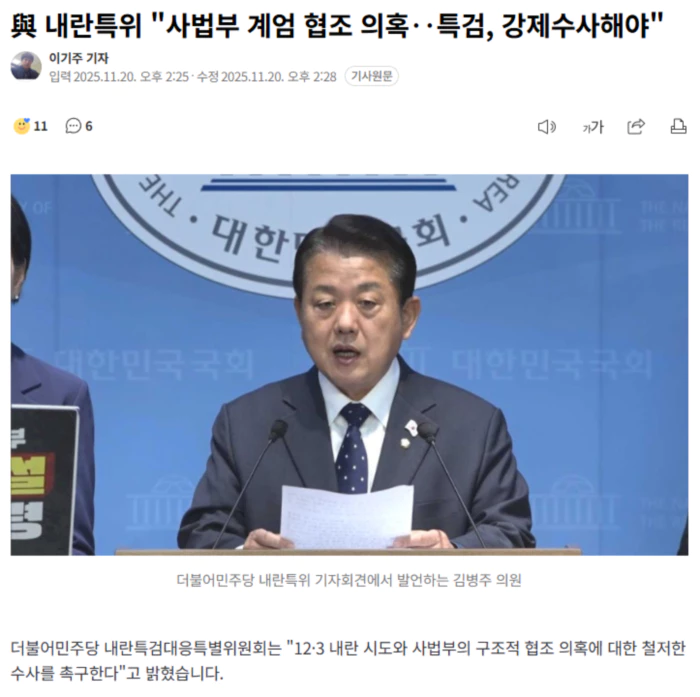 이어 "윤석열 정권은 헌정질서를 뒤흔드는 비상계엄을 선포했고 그 직후 사법부는 심야 긴급회의를 열었다"며 "이 회의는 단순 상황 파악이 아니"라고 주장했습니다.