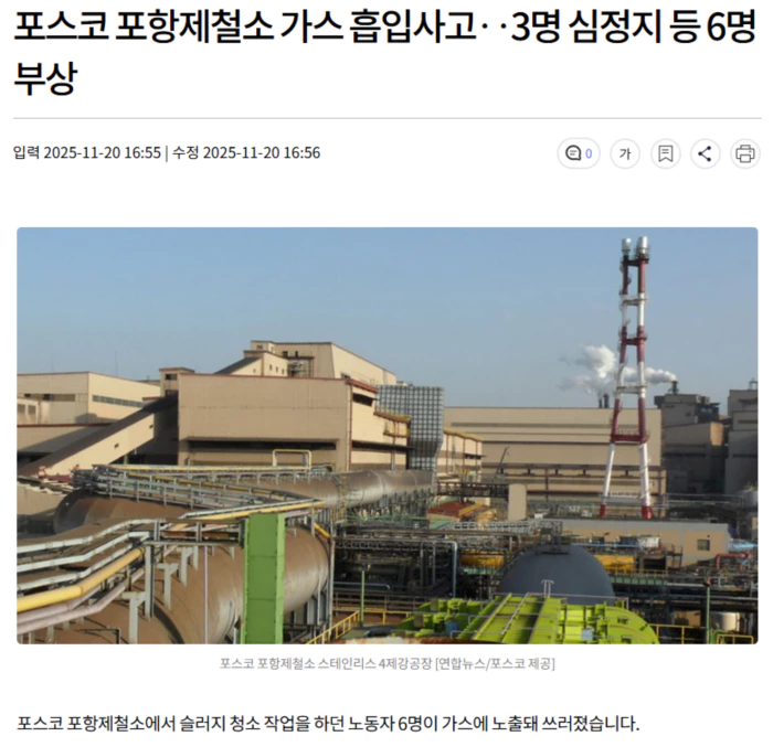 경찰에 따르면 오늘 오후 1시 반쯤 경북 포항시 남구 포항제철소 스테인리스 4제강공장에서 6명이 작업 도중 일산화탄소로 추정되는 가스를 마신 뒤 의식을 잃고 쓰러졌습니다.