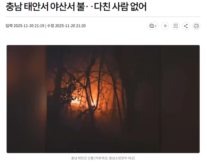 오늘(11/20) 저녁 6시 20분쯤 충남 태안군 소원면 의항리의 한 야산에서 불이 나, 약 2시간 반 만에 꺼졌습니다.
