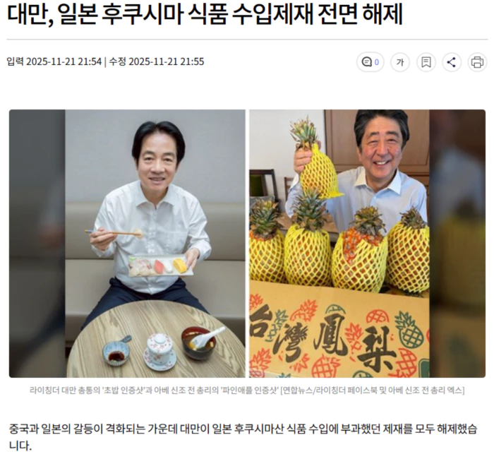 앞서 대만 유사시 개입을 시사한 다카이치 일본 총리 발언에 대한 반발로 중국이 일본산 수입산 수입 재중단으로 보복하자, 라이칭더 대만 총통은 일본산 해산물로 만든 초밥을 먹는 사진을 공개하기도 했습니다.