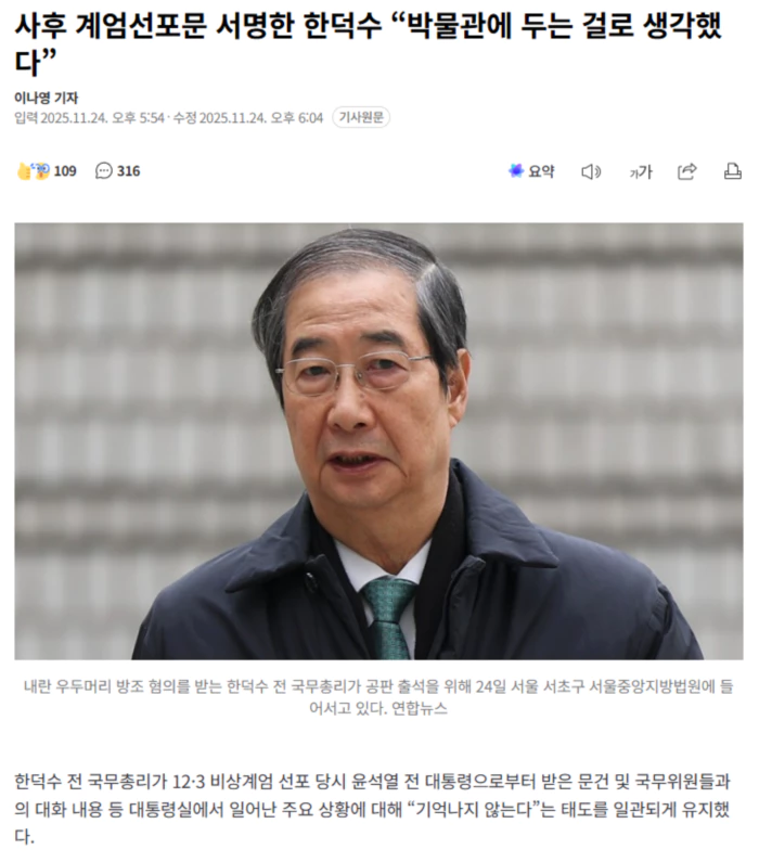 서울중앙지법 형사33부(재판장 이진관)는 24일 내란 우두머리 방조 등 혐의로 기소된 한 전 총리 사건 재판에서 피고인 신문을 진행했다. 한 전 총리는 ‘계엄 선포 당시 대통령 집무실에서 들고나온 문건 2개가 무엇이냐’는 특검팀 질문에 “기억하지 못한다. 기억이 굉장히 부족해 부끄럽고 국민께 죄송하다”고 답했다. 문건을 소지하게 된 경위에 대해서도 한 전 총리는 “방(대통령 집무실)에서 나갈 때 앞에 있는 것들 모아서 주머니에 넣은 거로 인식한다. 재판장께서 저한테 ‘대통령실 폐회로텔레비전(CCTV) 보고 어떤 생각이 드느냐’고 아픈 말씀을 해주셨습니다만 너무나 인지하지 못했던 거 같다”고 말했다. 한 전 총리는 당시 이상민 전 행정안전부 장관과 대접견실에서 16분 동안 나눈 대화와 관련해 재판장이 “대화 시간이 상당한데 기억나지 않느냐”고 물었지만 “전혀 안 난다”고 답했다. 앞선 재판에서는 계엄 선포 당일 국무회의가 열린 대통령실 대접견실 영상 등이 법정에서 공개됐다. .. 후략 ..