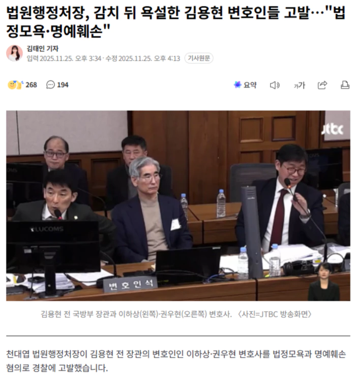 법원행정처는 오늘(25일) 입장문을 통해 "지난 19일 서울중앙지방법원에서 감치 재판을 받은 변호사들은 감치 과정과 그 이후에 유튜브 방송 등을 통해 법정과 재판장을 중대하게 모욕했다"고 밝혔습니다. 이어 "이는 법조인으로서 품위와 책임을 저버린 행위일 뿐 아니라, 사법권과 사법질서 전체에 대한 중대한 부정행위"라며 "이번 사안의 심각성과 중대성, 그로 인한 사법질서의 혼란을 매우 엄중하게 인식한다"며 고발 사유를 설명했습니다. 또 "표현의 자유의 한계를 넘어 모욕 또는 소동 행위로 법원의 재판을 방해하고, 개별 사건을 담당하고 있는 재판장에 대해 무분별한 인신공격을 하는 행위는 재판과 법관의 독립을 해하고 재판제도에 대한 신뢰를 떨어뜨려 법치주의를 훼손하게 된다"고 지적했습니다. 그러면서 "재판을 방해하면서 법정을 모욕하고 재판장의 명예를 훼손하는 것은 사법부 본연의 가치를 심각하게 훼손한다"며 "이러한 행위에 대해서는 선처 없는 단호하고 엄정한 제재가 반드시 필요하다"고 강조했습니다. 내란 중요임무종사 혐의로 구속기소 된 김 전 장관의 변호인인 이 변호사와 권 변호사는 재판에서 재판부를 모욕하고 유튜브 방송에서 재판장을 겨냥해 욕설을 한 혐의 등을 받고 있습니다. 앞서 서울중앙지법 형사합의33부는 지난 19일 한덕수 전 국무총리의 내란 우두머리 방조·내란 중요임무 종사, 위증 혐의 공판에서 소란을 피운 이 두 변호사에게 감치 15일을 선고했습니다. 당시 김 전 장관은 해당 재판 증인으로 출석했습니다. 재판장인 이진관 부장판사는 두 변호사가 김 전 장관과 동석하는 것을 금지했으나, 두 사람은 방청석에 앉아 발언을 했습니다. .. 후략 ..