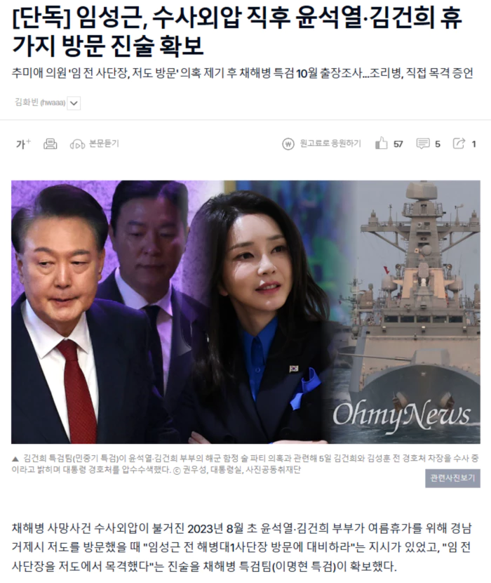 <오마이뉴스>가 추미애 더불어민주당 의원실 등을 통해 확인한 내용에 따르면, 특검팀은 지난 10월 17일 국회 법제사법위원회 군사법원 국정감사 당시 제기된 '임성근 저도 방문 의혹' 수사 과정에서 위와 같은 진술과 증언을 확보했다. 앞서 추 의원은 "임 전 사단장이 2023년 8월 4일 새벽 1~2시경 윤석열·김건희 부부 여름휴가 장소인 저도에 방문했다"는 의혹을 제기한 바 있다. 특검팀은 지난 10월말부터 '수사외압 시기 임성근 저도 방문' 의혹을 들여다보기 위해 ▲ 거제 저도 경비를 담당했던 해병 병사(예비역) ▲ 해군 진해기지사령부 소속 조리병(예비역) 등에 대해 출장조사를 진행했다. 특검팀은 조사 과정에서 경비를 담당했던 해병 병사로부터 "초소의 장이었던 상급자(부사관)가 임 전 사단장 방문에 대비하라는 지시를 했다"는 진술을 확보했다. 임 전 사단장 방문 대비 지시가 내려온 뒤에는 "해군 함정이 저도를 방문했다"고 한다. 특검팀은 해군 진해기지사령부 소속 조리병으로부터도 "임 전 사단장을 (저도에서) 직접 목격했다"는 진술도 받았다. 추 의원은 지난 군사법원 국정감사에서 "(2023년 8월 4일 새벽) 저도에서 임 전 사단장을 목격했던 해병대1사단 수색대대 경호 인력은 임 전 사단장을 발견하고 놀라 경례 대신 군화 뒷꿈치를 탁탁 치며 경례를 했다고 한다"며 "포항에 있던 해병대1사단 수색대대 인원들이 저도 외곽 경호 강화를 위해 파견돼 있었기 때문에 임 전 사단장은 대통령경호처 통제를 거치지 않고 저도에 들어갈 수 있었다"고 주장했다. .. 후략 ..