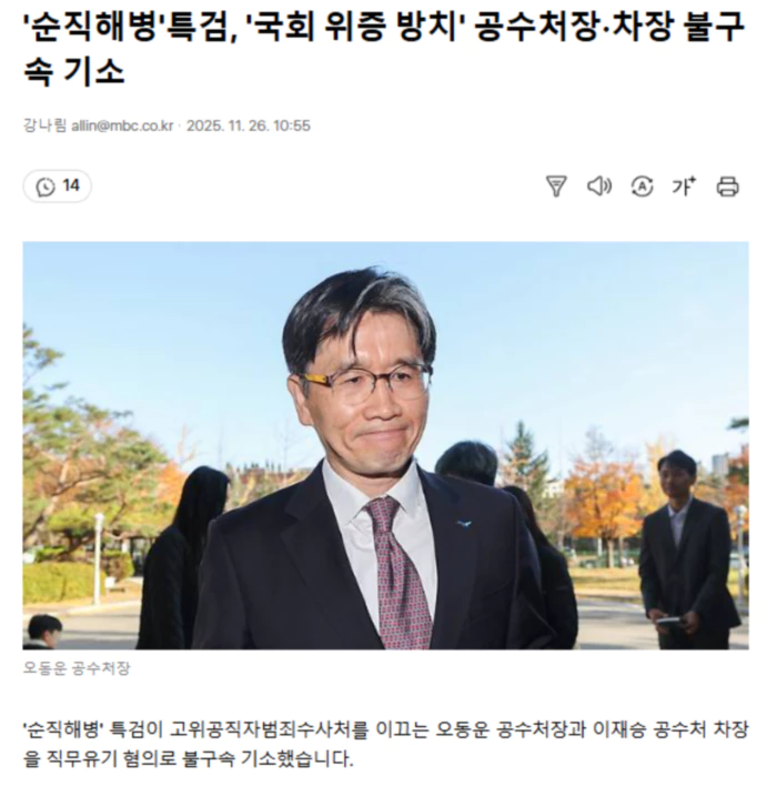 오 처장과 이 차장은 지난해 8월 송창진 전 공수처 부장검사의 위증 혐의 고발 사건을 접수한 이후 사건을 대검찰청에 통보·이첩하지 않고 방치한 혐의를 받습니다. 송 전 부장검사는 지난해 7월 국회 법제사법위원회에서 "윤석열 전 대통령에 대한 통신기록 영장이 모두 기각됐다", "수사외압 사건에 이종호 전 블랙펄인베스트 대표가 연루된 사실을 몰랐다"는 허위 증언을 한 혐의로 더불어민주당 의원들에 의해 고발됐습니다. 공수처법에 따르면 공수처장은 소속 검사의 범죄 혐의를 발견한 경우 관련 자료와 함께 이를 대검에 통보해야 하는데, 특검팀은 오동운 처장과 이재승 차장이 고발 사건을 이첩하지 않는 행위가 위법·부당한 사건처리라는 점을 잘 알면서도 당시 고발이 공수처 지휘부를 겨냥한 부당한 정치적 공격이라고 보고 아무 조치를 하지 않았다고 판단했습니다. 당시 사건을 처음 배당받은 박석일 전 공수처 부장검사도 위증 사건에 대해 아무 조사 없이 고발장 접수 이틀 만에 무혐의로 결론 내린 보고서를 작성하는 등 직무유기 혐의로 함께 기소됐습니다. 특검팀은 채상병 순직 사건 수사를 방해한 송 전 부장검사와 김선규 전 부장검사도 각각 직권남용 혐의로 재판에 넘겼습니다. 특검팀은 공수처가 채상병 순직 사건을 수사하던 시기 공수처 처장·차장직을 대행했던 김 전 부장검사와 송 전 부장검사가 수사 방해를 통해 윤 전 대통령으로 수사가 향하는 것을 차단하려 했다고 판단했습니다. .. 후략 ..