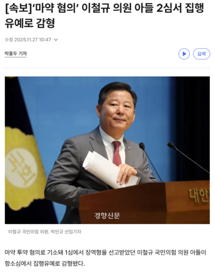 서울고법 형사3부(재판장 이승한)는 27일 마약류 관리에 관한 법률 위반(향정) 혐의를 받는 이 의원의 아들 이모씨에게 징역 2년6개월에 집행유예 5년을 선고했다. 200시간의 약물중독 재활교육 프로그램 이수와 477만원 추징도 명령했다. 이씨 부인 임모씨에게는 1심과 같은 징역 2년6개월에 집행유예 3년을 선고했다. 임씨에게도 40시간의 약물 중독 재활교육 프로그램 이수, 173만원 추징을 명령했다. 이들에게 마약을 판매한 혐의를 받는 중학교 동창 정모씨는 1심 징역 3년에서 징역 2년6개월로 감형됐고, 이씨의 군대 선임 권모씨는 1심 징역 3년에 집행유예 5년이 유지됐다. 재판부는 “구속 이후 7개월간 반성 기회를 가진 것으로 보이고 동종 전과가 없는 점, 마약류 매수는 개인 투약 목적으로 제3자에게 유통하는 등 위험성이 전파되지 않은 점 등을 고려할 때 원심의 형은 다소 무겁다고 판단된다”고 설명했다. 재판부는 또 가족들이 선처를 탄원하고 부양해야 할 어린아이가 있는 점, 이씨의 태도에 진정성이 있어 보이는 점도 고려했다고 부연했다. 이씨 부부는 지난해 10월부터 지인들과 함께 최소 9차례 대마 매수를 시도한 혐의를 받는다. 이씨가 정씨에게 돈을 건네면 정씨가 판매상을 통해 마약을 구매해 이씨에게 전한 것으로 조사됐다. 이씨가 직접 판매상에게 연락해 합성대마 10mL를 60만 원에 매수하기로 했으나, 판매상이 마약 보관 장소를 알려주지 않아 미수에 그친 경우도 있는 것으로도 전해졌다. 이씨 등은 렌터카를 타고 다니며 서울 강서구 아파트 단지, 서초구 오피스텔 앞 화단, 아파트 양수기함, 수원 아파트 단지 내 공터 땅속 등에서 마약을 수거하려고 했으나 발견하지 못해 미수에 그친 혐의도 받는다. .. 후략 ..