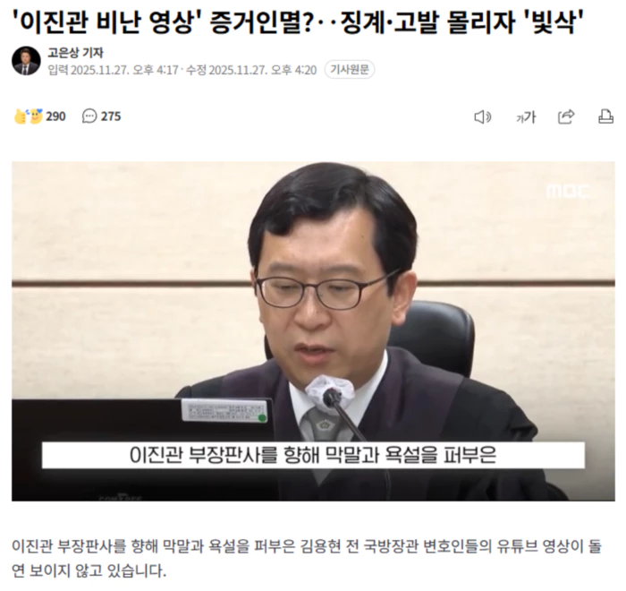 김 전 장관 측 이하상 변호사 등이 운영하는 유튜브 방송 채널에서, 이 판사를 향해 "벌벌 떨었다" "약한 놈", "징징댄다" 운운하며 비난했던 영상이 삭제 또는 비공개 처리된 겁니다. 법관 모독 논란이 강하게 제기되고, 법원행정처의 형사고발과 서울중앙지법의 징계 요청 등이 동시다발적으로 이뤄지자 영상을 급하게 내린 것으로 보입니다. 앞서 이들은 이진관 판사가 자신들을 향해 감치명령을 내리고 집행을 시도하자 인적사항을 진술하지 않는 등 거부했다가, 결국 석방되자 유튜브에 나와 이 판사를 원색적으로 비난했습니다. [이하상/변호사(출처: 유튜브 '진격의 변호사들')] "여러분들 이진관이가 벌벌벌 떠는 걸 보셨어야 돼요. 걔 약한 놈입니다. 그거 진관이 그거 전문 용어로 뭣도 아닌 XX인데 엄청 위세를 떨더라고요. 근데 벌벌벌 떨었습니다." [이하상/변호사(출처: 유튜브 '진격의 변호사들')] "진관아 딴 데 가서 징징거리지 말고 우리하고 일대일로 한번 붙어 보자. 너 뭐 판사라고 권력 있다고 떵떵거리고 있잖아 지금. 뭐 법원장한테 어 쫓아가서 징징거리고 있냐." 이에 대해 법원행정처는 이하상, 권우현 두 변호사를 법정모욕과 명예훼손 등 혐의로 서초경찰서에 고발했고, 서울중앙지법도 이들 변호사의 행위는 징계 사유에 해당한다며 대한변협에 통보했습니다. .. 후략 ..