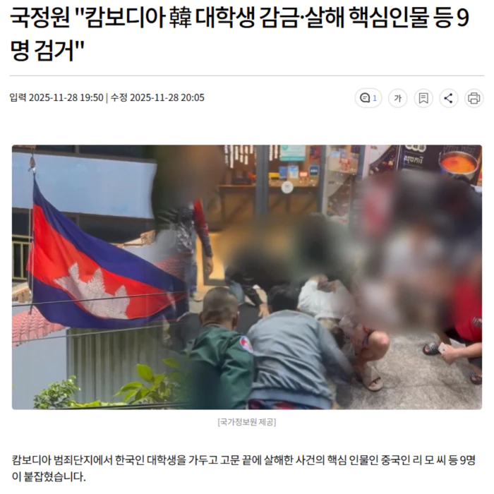 국가정보원은 어제 새벽 캄보디아 수도 프놈펜의 한 식당에서, 한국인 대학생 사망사건의 배후인 리 씨 등 중국인 4명과, 이들과 함께 있던 한국인 5명을 현지 경찰과 협조해 체포했다고 밝혔습니다.