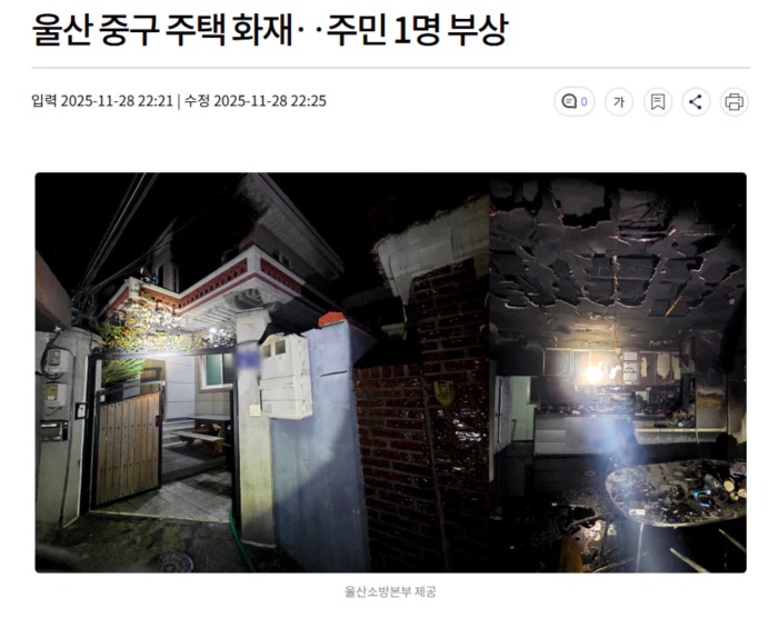 오늘(11/28) 오후 6시쯤 울산시 중구의 한 2층짜리 단독주택에서 불이 나 약 20분 만에 꺼졌습니다.