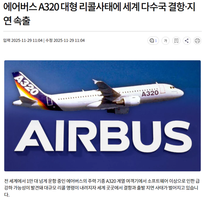 세계에서 A320 항공기를 가장 많이 보유한 미국 아메리칸항공은 자사가 보유한 A320 계열 480대 중 340대가 리콜 대상이라고 밝혔습니다.