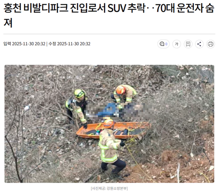 오늘(11/30) 오후 4시쯤 강원 홍천군 서면 팔봉리 비발디파크 진입로에서 SUV가 10미터 아래 낭떠러지로 추락했습니다.