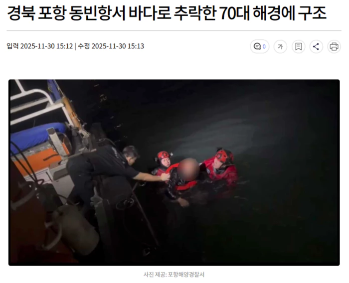 어제(11/29)저녁 6시쯤 경북 포항시 동빈항 앞바다에 70대 남성이 추락해 빠지는 사고가 났습니다.
