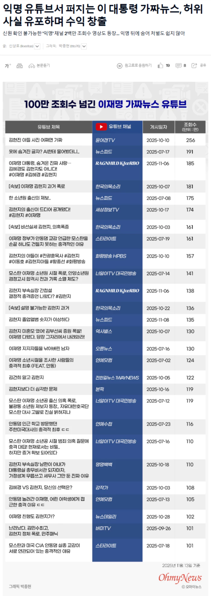 이재명 대통령과 측근을 둘러싼 가짜뉴스가 유튜브 채널을 중심으로 확대 재생산되면서 수익 창출 도구로 사용되는 것으로 나타났다. <오마이뉴스>는 2021년 1월부터 2025년 11월 13일까지 이재명 대통령과 김현지 대통령실 전 총무비서관 등과 관련, ▲ 명백한 허위사실이 담긴 내용 ▲의혹을 제기하면서도 근거가 부실한 내용 ▲단순 의혹을 제기하는 낚시성 내용의 '허위사실' 유튜브 영상들을 수집했다. 영상 수집은 유튜브 API를 활용한 자동 수집 코드를 활용했으며, 개별적인 검수를 통해 조회수 100만 건이 넘긴 동영상들을 추렸다. - 부적절한 내용 담은 낚시성 영상, 조회수 100만 넘겨 분석 결과, 유튜브 조회수 100만 건을 넘은 가짜뉴스 영상(11월 13일 기준)은 27건(17개 유튜브 채널)으로 나타났다. 해당 영상들은 대부분 '이재명 대통령이 소년시절 범죄를 저질렀다'거나, '이재명 대통령과 김현지 전 총무비서관과의 개인적 관계가 있다'는 내용의 허위사실을 주장하거나 암시하는 내용을 담고 있었다. 가장 많은 조회수를 기록한 윤어갠TV 채널의 '김현진(지) 아들 사진 어쪄면 가짜'(10월 10일) 영상은, 누적 조회 수만 256만건에 달했다. 이 영상은 '보수ON'이라는 유튜브 채널 영상을 짜깁기한 쇼츠 영상이다. 단순히 사진 몇 장을 억지로 끼워맞춰 이재명 대통령과 김현지 전 비서관이 마치 사적 관계가 있는 것처럼 암시했다. 조회수 191만회를 기록한 '옷에 숨겨진 글자? AI한테 물어봤더니..'(뉴스피드, 7월 17일)의 경우, 이재명 대통령이 과거 강력범죄를 저질렀다는 허위사실을 강하게 암시하는 내용이다. 해당 영상은 이재명 대통령의 대학 수험표 사진(영상에는 사진 부분을 모자이크 처리함)과 함께 "챗GPT는 당 복장이 1970에서 1980년대 소년원 혹은 교정 기관에서 착용하던 제복일 가능성이 높다고 분석했다"는 AI 멘트가 나온다. '이재명 대통령이 과거 소년원에 있었고, 대학 수험표 사진도 소년원 복장으로 찍었다'는 허위사실을 표현했다. 185만 조회수를 기록한 '이재명 대통령, 숨겨온 진짜 사랑...'(Ragnhild Kjærbo, 11월 6일)영상의 경우 "이재명의 마음을 차지한 단 한 사람. 그 주인공은 누구일까요?"라는 멘트로 끝나는 낚시성 영상이었다. 해당 영상을 올린 유튜브 17개 채널들은, 허위사실을 비롯, 극우 성향의 영상을 지속적으로 올리면서 구독자를 확보하고 있다. 버미TV의 경우, 66만4천여명의 구독자를 확보했고, 한국의 목소리 54.5만, 뉴스피드 47.9만, 윤어갠TV 36.2만, 화평방송 HPBS 15.3만, 세상정보TV 13.8만, 스타라이트 10.9만 등으로 나타났다. .. 후략 ..