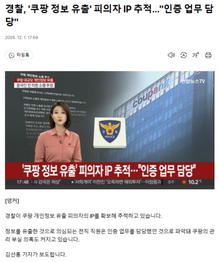 [기자] 쿠팡 고객 3,300여만명의 개인정보가 유출됐다는 사실이 알려지며 논란이 커지는 가운데 경찰도 수사에 속도를 내고 있습니다. 이미 유출 관련 언론보도를 보고 지난 21일부터 내사를 시작했던 경찰은 쿠팡 측으로부터 고소장을 접수한 뒤 정식 수사에 착수했습니다. 서울경찰청은 기자간담회에서 "현재 서버 기록을 받아 분석 중"이라며 "피의자가 범행에 사용한 IP를 확보해 추적 중"이라고 밝혔습니다. 현재 2개의 계정에서 쿠팡 측에 2차례 협박 메일이 보내진 사실도 파악했는데, 개인정보를 유출한 피의자와 동일인인지는 아직 확인 중입니다. 중국 국적의 퇴직한 직원의 소행으로 추정되고 있는 가운데 경찰은 "모든 가능성을 열어두고 수사 중"이라며 해외 기관 공조도 진행하고 있다고 덧붙였습니다. 쿠팡 측의 미진한 대응에 대한 수사로 확대될 가능성도 거론되고 있습니다. 고객 민원부터 정식 고소장 접수까지 일주일 넘게 걸린 상황. 쿠팡의 은폐·축소 의혹이 제기되면서 경찰도 "기술적 취약점 등에 대한 분석도 있을 예정"이라고 말했습니다. 일부 전문가들은 지난 6월부터 개인정보 탈취 시도가 있었는데 쿠팡이 인지하지 못한 걸 두고 보안 체계가 빈약했을 수 있다고 지적했습니다. .. 후략 ..