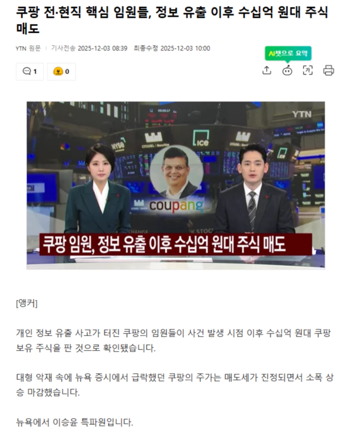 [기자] 거랍 아난드 쿠팡 최고재무책임자, CFO는 지난달 10일 쿠팡 주식 7만 5,350주를 주당 29.0195달러에 팔았습니다. 미국 증권거래위원회, SEC에 공시된 매도 가액은 218만 6천 달러, 우리 돈으로 32억 원에 달합니다. 프라남 콜라리 전 부사장도 지난달 17일 쿠팡 주식 2만 7,388주를 매도했다고 신고했는데 매각 가치는 11억 3천만 원 정도입니다. 검색과 추천 부문을 총괄하던 핵심 기술 담당 임원으로, 지난달 14일 사임했습니다. 두 임원의 쿠팡 주식 매도 시점은 쿠팡이 개인 정보 유출 침해 사고 발생 사실을 인지했다고 밝힌 시점 이전입니다. 하지만 민감한 시점에 발생한 전·현직 임원의 주식 처분은 내부자 거래 논란을 부를 수 있습니다. 앞서 쿠팡은 지난달 18일 고객 4,500여 명의 개인 정보가 유출된 침해사고 발생 사실을 인지했다고 관계 당국에 피해 사실을 최초 신고했습니다. 한국 인터넷 진흥원의 침해 사고 신고서엔 쿠팡은 지난달 6일 자사 계정 정보에 대한 무단 접근이 발생했다고 보고했습니다. 쿠팡 측은 이번 사태와 관련해 정부 조사와 경찰 수사에 적극 협조하겠다는 방침입니다. .. 후략 ..