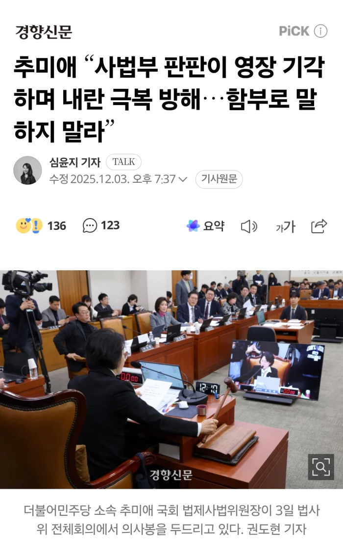 더불어민주당 소속인 추미애 위원장은 이날 법사위 전체회의에서 천대엽 법원행정처장을 향해 “정치적으로 이미 국민들은 내란을 극복해냈다”면서 “그 극복을 방해하는 것이 바로 사법부다. 판판이 영장을 기각하고 있지 않나”라고 말했다.
