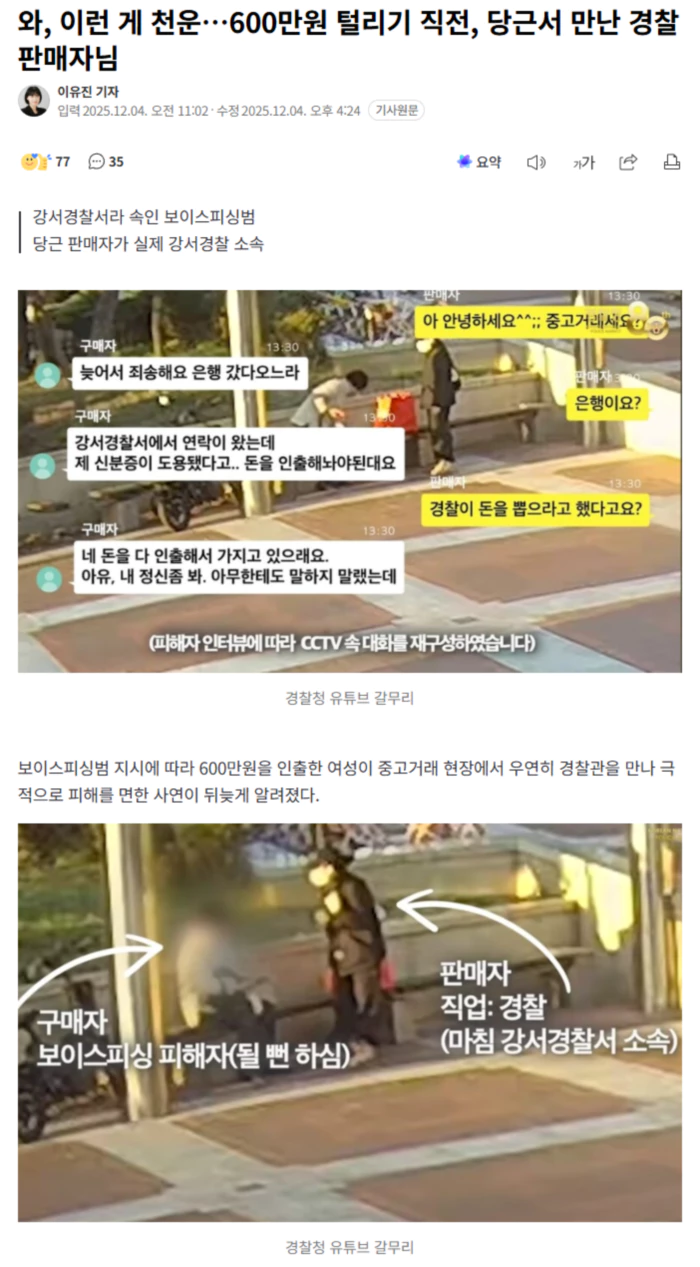 지난 1일 경찰청 유튜브에 올라온 영상을 보면, 휴직 중인 서울 강서경찰서 소속 경찰관 ㄱ씨는 지난달 서울의 한 주택가에서 중고물품을 팔기 위해 구매자를 기다리고 있었다. 약속 시간을 넘겨 도착한 구매자 ㄴ씨는 “늦어서 죄송하다. 은행에 갔다 오느라 (늦었다)”고 말했다. “강서경찰서에서 연락이 왔는데 신분증이 도용돼 돈을 인출해놔야 된다고 (했다)”는 것이었다. 이상한 낌새를 감지한 ㄱ씨는 “경찰이 돈을 뽑으라고 했다고요?”라고 되물었다. 그러자 ㄴ씨는 “네. 돈을 다 인출해서 가지고 있으래요. 아유, 내 정신 좀 봐. 아무한테도 말하지 말랬는데”라고 답했다. 이에 ㄱ씨는 “이거 보이스피싱 같다. 사실은 저도 경찰”이라며 강서경찰서 소속임을 밝혔다. 이후 ㄱ씨는 강서경찰서로 직접 연락해 보이스피싱범이 사용한 번호의 업무폰이 있는지 확인했고 ㄴ씨를 인근 지구대로 안내해 피해 신고를 도왔다. .. 후략 ..