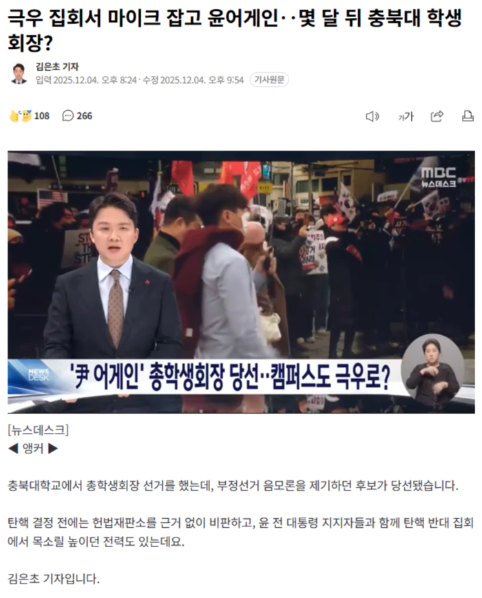 ◀ 리포트 ▶ 지난 3월 충북대에서 열린 윤석열 전 대통령 탄핵 촉구 집회. 그런데 갑자기 극우 유튜버들이 몰려와 집회 중인 학생들을 폭행하고, "지네가 잘난 줄 알아. 이 빨갱이 XX들이." 학생들의 현수막을 빼앗아 불까지 지릅니다. "불태웠다! 불태웠다!" 당시 충북대에선 이들 지지자들과 함께 탄핵 반대 집회를 이끌었던 재학생이 있습니다. [문병주/당시 집회 주최 측 (지난 3월)] "헌법재판소의 편향성, 그리고 부정선거 관련해서 사람들이 많은 의혹을 제기하고 있다고…" 그런데 지난달 27일 이 학생은 충북대의 내년도 총학생회장으로 당선됐습니다. 그는 극우 유튜버와의 직접 연관성은 부인했지만 탄핵반대 입장은 여전한지 묻자 이렇게 답했습니다. [문병주/충북대 총학생회장 당선자] "저는 입장을 밝히는 것 자체가 어떻게 보면 너무 학교를 정쟁의 도구로써 사용하는 느낌이 강한 질문이어서 사실 입장은 없다라고…" 문 씨는 투표율 52.9%, 득표율은 63%으로 경쟁 후보를 여유 있게 따돌렸습니다. [충북대 재학생(음성변조)] "탄핵을 반대했으니까 이 후보자를 뽑자 그런 생각을 갖고 투표하진 않았고, 그 사람이 선거운동하고 공약을 보고 그런 걸 중점으로 보고…" 12.3 내란 사태가 발생한 지 1년. 탄핵반대를 외치며 극우 유튜버들이 재학생을 폭행했던 일은 어느새 잊히고 있습니다. [충북대 재학생(음성변조)] "(집회는) 이미 했으니까 어쩔 수 없고. 그 사람 사상이니까 존중하고, 이 학교에서 이제 더 나아가는…" [충북대 재학생(음성변조)] "탄핵 반대 활동을 했던 이력이 있다는 걸 알았으면 다른 분을 뽑지 않았을까…" 학생들의 선택은 존중받아야 하지만 캠퍼스 우경화를 경계하는 목소리도 큽니다. .. 후략 ..