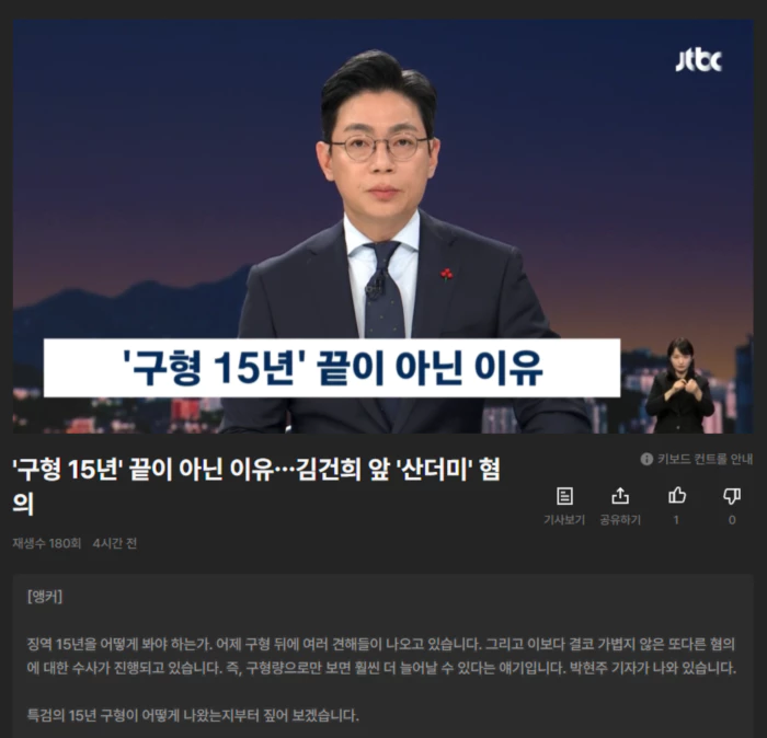 [앵커] 징역 15년을 어떻게 봐야 하는가. 어제 구형 뒤에 여러 견해들이 나오고 있습니다. 그리고 이보다 결코 가볍지 않은 또다른 혐의에 대한 수사가 진행되고 있습니다. 즉, 구형량으로만 보면 훨씬 더 늘어날 수 있다는 얘기입니다. 박현주 기자가 나와 있습니다. 특검의 15년 구형이 어떻게 나왔는지부터 짚어 보겠습니다. [기자] 특검은 "역사에 영원히 부끄럽게 기록될 법치 파괴 행위"라며 "각 최고형 선택돼도 부족함이 크다"고 설명했습니다. 3개 사건 중에서 도이치 주가조작과 건진법사 청탁 의혹을 합해 11년. 명태균 여론조사에 따른 정치자금법 위반 4년입니다. 공천개입과 관련한 선거법 사건은 분리 선고해야 한다는 규정 때문에 나눴습니다. [앵커] 그러면 양형 기준에 따르면 최고형을 구형한 게 맞습니까? [기자] 일단, 주가조작은 법정형이 징역 3년 이상에서 30년까지로 범위가 넓습니다. 참고로 도이치모터스 주가조작 주범인 권오수 전 회장이 징역 3년에 집행유예 4년을 받았습니다. 알선수재 혐의는 법정형이 징역 5년 이하입니다. 그런데 특검이 두 사건을 합해서 징역 11년을 구형한 것은 수법 불량과 증거 은폐, 반성하지 않는 점 등 김건희 씨에게 불리한 가중 요소를 대부분 반영한 것으로 볼 수 있습니다. 그리고 정치자금법 위반은 권고 형량이 2년인데 특검은 4년을 구형했습니다. 이 역시도 죄질 등의 가중 요소를 대부분 반영한 결과라고 볼 수 있습니다. [앵커] 여기에 더해서 벌금 20억원과 추징금 9억4000여만원도 있잖아요? [기자] 특검은 도이치모터스 부당이득은 8억1000만원으로 봤고요. 건진법사 청탁 의혹은 8천200만원입니다. 합하면 9억원 정도인데요. 벌금은 부당이득이나 불법 금품수수 금액에서 가중해서 선고할 수 있습니다. 이 때문에 9억의 2배 이상 되는 20억원을 구형했습니다. 특검은 추징금 역시도 김건희 씨가 얻은 부당이득 등을 법이 허용하는 선에서 최대치로 계산해 9억4000여만원으로 결론냈습니다. [앵커] 지금 수사 중인 것도 모두 재판에 넘겨지게 될 텐데 추가될 부분도 짚어주시죠. [기자] 무엇보다 형량이 무거운 건 뇌물 혐의입니다. 현재 특검이 뇌물로 의심하는 6200만원짜리 반클리프 목걸이를 포함해 서희건설이 선물한 3종 세트만 총 1억1000만원입니다. .. 후략 ..