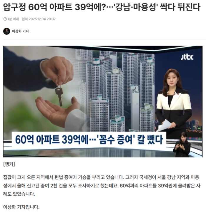 [기자] 아버지로부터 서울 압구정동 아파트를 증여받은 A씨. 같은 단지의 동일 평형 아파트가 60억원에 거래됐는데 지인을 통해 알게 된 감정평가 법인에 시가보다 낮게 평가해달라고 부탁했고, 시가의 65% 수준인 39억원에 증여세를 신고했습니다. 이를 통해 10억원 가량을 탈세했습니다. B씨는 담보대출이 끼어있는 송파구의 20억원 아파트를 어머니로부터 물려받았습니다. 그런데 대출상환는 본인 월급으로 했지만 어머니로부터 생활비와 자녀 유학비, 해외 여행비를 신고 없이 받고 있었습니다. [오상훈/국세청 자산과세국장 : 문제가 되죠. 그 부분에 대해 증여를 했으니까 그 부분도 증여세를 신고했어야 되는데 증여 과정의 전후까지도 저희가 들여다본다는 거죠.] 집값이 크게 오르자 편법과 꼼수를 써서 증여하는 사례가 많아지고 있습니다. 국세청이 고가 아파트가 밀집한 서울의 강남 4구와 마포, 용산, 성동구의 올해 증여 2천여 건에 대해 전수 조사에 나서기로 한 이유입니다. 과세당국이 이렇게 특정지역을 집중 검증하는 건 이번이 처음입니다. [오상훈/국세청 자산과세국장 : 10월 15일 대책 이후에 편법적인 증여 거래가 의심되는 사례들이 많이 나타나거든요. 증여 거래는 정부 결정 세목이기 때문에 전부 검증이 원칙입니다.] 서울에서 아파트와 빌라 등의 집합건물 증여는 7700여 건으로 3년만에 최대입니다. .. 후략 ..