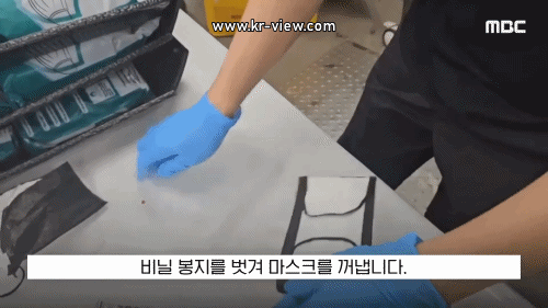 비닐 봉지를 벗겨 마스크를 꺼냅니다.
