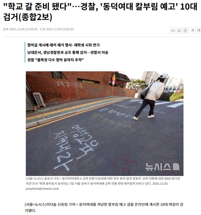 4일 서울경찰청에 따르면 남대문경찰서는 이날 동덕여대를 겨냥해 칼부림 예고글을 게시한 10대 여성 A씨를 특정하고 주거지인 마산 관할 경남경찰청과 공조를 통해 검거했다고 밝혔다. A씨는 전날(3일) 동덕여대를 겨냥해 '학교에 갈 준비가 됐다'는 영어 문구와 함께 가방 속 칼 사진이 첨부한 온라인 게시글이 게시한 혐의를 받는다. 경찰은 A씨의 주거지인 마산 관할 경찰서로 사건 이송해 구체적인 범행경위 등을 조사할 예정이다. 칼부림 예고글이 올라오면서 이날 오후 2시에 예정돼 있던 교내 래커 제거 행사와 재학생 시위는 잠정 연기됐다. '민주없는 민주동덕'은 이날 오후 2시부터 서울 성북구 월곡캠퍼스 백주년기념관 외부 계단에서 약 1시간 동안 공학 전환에 반대하는 집회를 열 계획이었다. 동덕여대 역시 이날 오전 칼부림 예고 글로 인한 안전 우려를 이유로 캠퍼스 래커 제거 행사를 잠정 연기한다고 밝혔다. 학교 측은 홈페이지를 통해 "최근 온라인상에 학교를 대상으로 한 위협성 글이 확인됐다"며 "행사 참여 인원의 안전이 우려돼 부득이하게 일정을 연기한다"고 설명했다. 한편 경찰은 지난 3월 공중협박죄 신설 이후 불특정 다수를 상대로 한 폭발물·흉기난동 등 범죄에 대해 태스크포스(T/F)를 구성해 추적수사·검거 활동을 이어왔다. .. 후략 ..