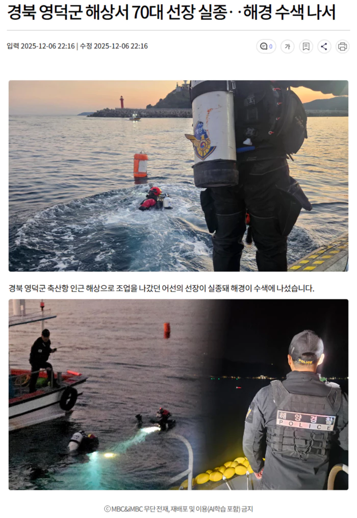해경은 '연락이 되지 않는다'는 가족 신고를 받은 뒤 경비함정과 연안구조정, 구조대를 투입해 축산항 북동쪽 해상에서 해당 어선을 찾았지만, 배 안에서 선장은 발견되지 않았습니다.