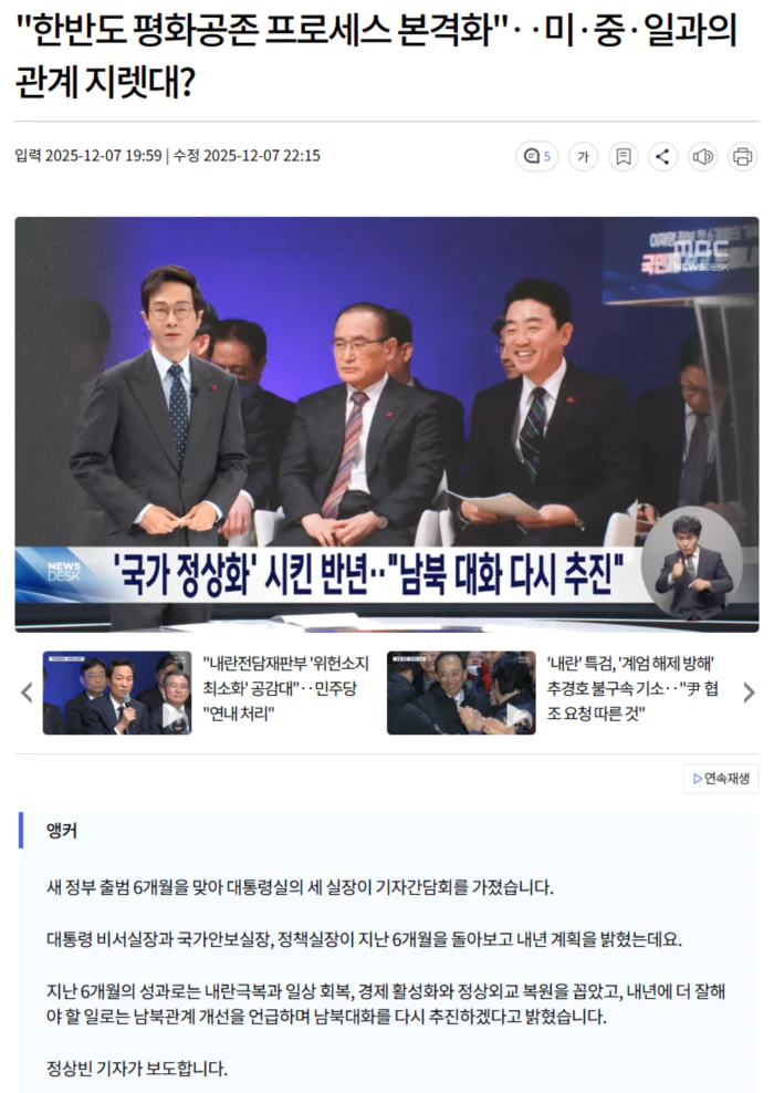 "흔들리던 외교안보를 다시 반석 위에 올린 시간"이라고 지난 6개월을 평가하면서도, "한반도 평화 문제에는 큰 진전이 없었다"고 돌아봤습니다.