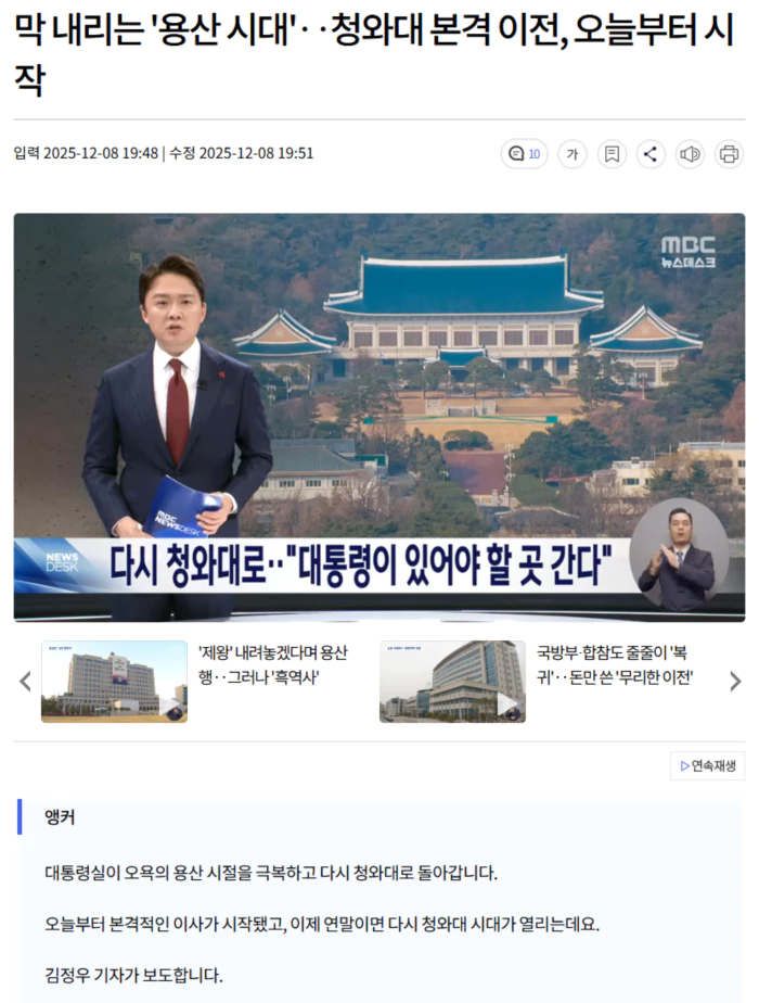 "대통령실은 '용산 시대'를 뒤로 하고 대통령이 원래 있었던 곳, 있어야 할 곳 청와대로 이전하겠습니다. 크리스마스 즈음이면 이사가 마무리될 것으로…"