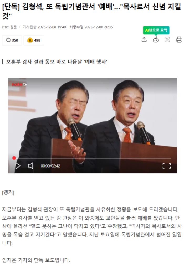 [기자] 김형석 관장은 올 5월 독립기념관에서 교회 예배와 ROTC 동기회를 열었습니다. [찬송일세…나 사는 동안 끊임없이…] 8월 JTBC 보도 이후 사퇴 압박이 커지자 김 관장은 국회에서 기자회견을 열고 언론을 탓했습니다. [김형석/독립기념관장 (지난 9월 8일) : 마치 관장이 역사적인 사실을 부정하고 독립운동을 폄훼한 것처럼 보도하였고…] 행사에 기념관 직원까지 동원됐다는 증언이 이어지자 보훈부는 감사를 시작했습니다. 감사 결과는 사흘전인 이달 5일 김형석 관장에게 전달됐고, 이의신청 기간 한달이 주어졌습니다. 그런데 결과 통보 바로 다음날인 6일 토요일. 김 관장은 독립기념관에서 또 예배 행사를 열었습니다. '한국독립운동과 기독교의 만남 개막식'이란 행사였는데 사실상 1시간 짜리 예배였습니다. [내 죄를 씻기 위하여…] 묵도로 시작해 찬송, 기도, 성경 봉독, 특송까지 이어졌습니다. 김형석 관장은 단상에까지 올랐습니다. [김형석/독립기념관장 : 1년 동안 말도 못 하는 고난이 닥쳐왔습니다. 이번에 또 '제2의 독립운동과 기독교 행사를 할 것이냐'고 힐난하고 이것은 우리가 잘못한 게 아무것도 없는데.] 김 관장은 자신이 목사이기 때문에 그 사명도 지키겠다고 했습니다. [김형석/독립기념관장 : 바른 역사를 지키기 위해서 목숨을 내놓고 살아야 되는 역사가의 사명을 받았는데 또 목사의 사명은 진리를 사수하기 위해서 목숨을 내어놔야 되는 것이 그 사명이구나.] 이들은 언론의 촬영까지 막았습니다. .. 후략 ..