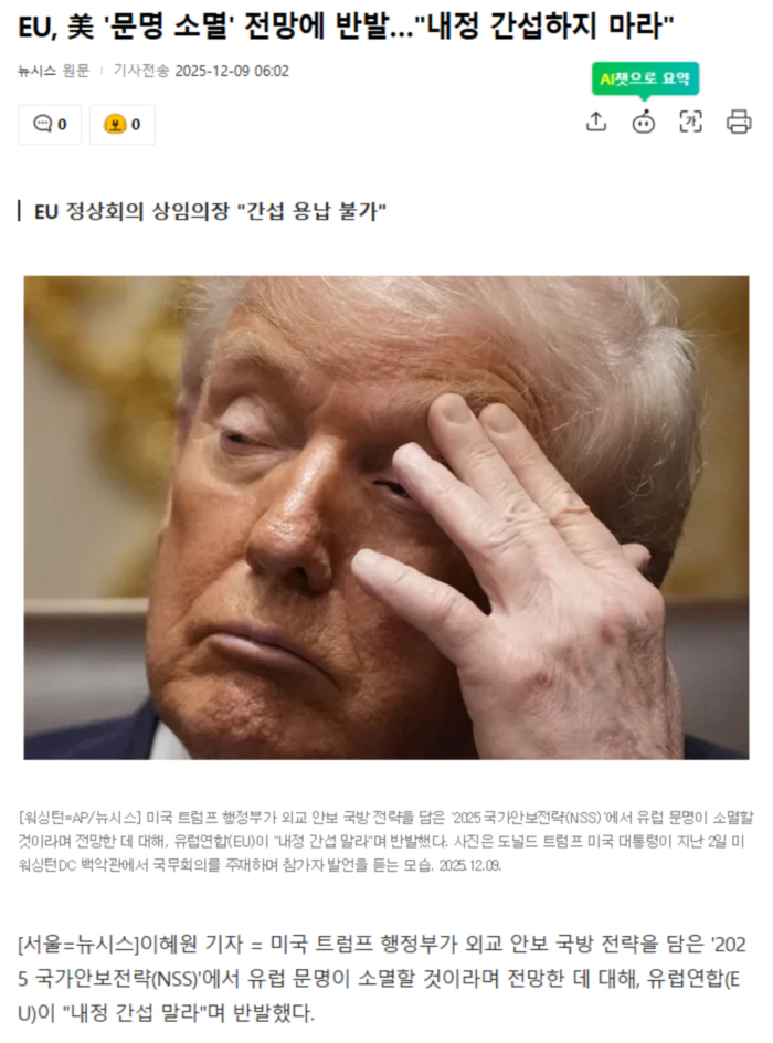 8일(현지 시간) AP 등에 따르면 안토니우 코스타 EU 정상회의 상임의장은 이날 프랑스 파리 자크 들로르 연구소에서 "동맹은 동맹국의 국내 정치적 선택에 간섭하겠다고 위협하지 않는다"고 말했다. 코스타 의장은 "우린 유럽 정치에 대한 간섭 위협을 용납할 수 없다"며 "미국은 유럽 시민을 대신해 어떤 정당이 좋고 나쁜지 선택할 수 없다"고 비판했다. 이어 "역사가 우리에게 가르쳐 준 바와 같이 정보의 자유 없인 언론의 자유도 있을 수 없다"며 "미국 기술 재벌들의 목적을 위해 시민들의 정보 자유가 희생된다면, 언론의 자유는 존재할 수 없게 된다"고 반박했다. 파비안 줄레크 유럽정책센터(EPC) 대표는 NSS가 유럽의 극단적 민족주의 정당을 고무시킨다며 "EU를 내부에서부터 갉아먹으려는 노력을 강화할 것"이라고 우려했다. 이어 "트럼프의 미국은 유럽의 자유와 기본 가치에 대한 동맹이 아닌 적대국"이라며 "그의 목표는 우리 민주주의 체제를 현재 미국에 뿌리내린 비자유주의적 포퓰리즘으로 대체하는 것이다"라고 강도 높게 비난했다. .. 후략 ..