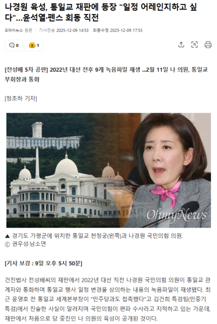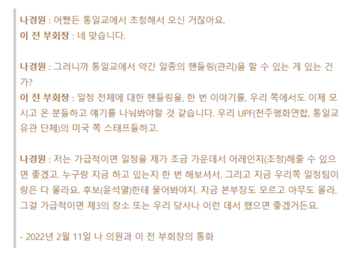 시기상 두 사람 통화에서 나오는 "일정"은 2022년 2월 11~13일 통일교가 주최한 '한반도 평화 서밋' 행사로 추정된다. 두 사람이 통화한 2월 11일은 행사 개회 날이었고, 윤석열은 행사 마지막 날인 13일 통일교가 초청한 마이크 펜스 전 미국 부통령과 만나 회동했다. 특검팀은 통일교가 대선 당시 윤석열의 당선을 밀어주는 과정에서 두 사람의 만남을 주선했다고 보고 있다. 이날 공개된 녹음파일 중에는 윤 전 본부장이 이 전 부회장과 통화하며 이재명 대통령(당시 후보) 측근의 이름을 언급하는 내용도 있었다. 윤 전 본부장은 2022년 1월 5일 통화에서 "여권(더불어민주당)을 (초청) 하려면, 일전에 몇 군데 어프로치(접촉)했다. 그거는 그거대로 하고 정진상 부실장이나 그 밑에 쪽은 (소통 중인 방식이) 화상 대담이잖나. 힐러리(전 미국 국무장관) 정도는 될 것 같다"고 말했다. 이는 윤 전 본부장이 '한반도 평화 서밋 행사에 이 대통령 또는 더불어민주당을 초청하기 위해 여러 곳에 접촉했다'는 취지로 이 전 부회장에서 설명하는 모습이다. .. 후략 ..