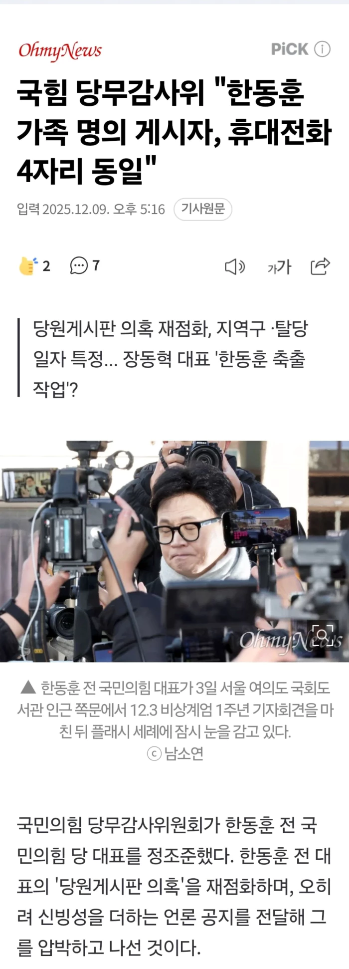 지난 3일, 12.3 비상계엄 및 내란사태에 대한 사과를 장동혁 국민의힘 당 대표가 사실상 거부하면서 그의 리더십이 시험대에 오른 상황이다. 리더십 위기를 맞은 장동혁 대표가, 당내 최대 걸림돌이라고 할 수 있는 한 전 대표를 정치적으로 축출하려는 듯한 모양새다. - "한동훈 가족과 동일 이름 사용 게시자, 서울 강남병 소속... 탈당일자 거의 동일" 국민의힘 당무감사위원회는 9일 오후 이호선 위원장 명의로 '기자단 긴급 공지'라는 제목의 문자메시지를 보냈다. "불필요한 오해를 막기 위해 사실관계를 명확히 안내드린다"라는 이야기였다. 이들은 우선 "현재까지 당 공식 채널을 통해 확인한 바, 당원 게시판에 대한 '전수조사'를 실시했다거나 그 결과를 확보했다는 사실을 확인한 바 없다"라며 "이에 따라 당무감사위원회가 확보한 관련 자료 또한 없다"라고 강조했다. 이미 자료를 확보해놓고도 사실관계를 밝히지 않고 있다는 일각의 추측을 부정한 것이다. 또한 "한동훈 전 대표 및 가족 명의로 게시된 것으로 알려진 글들에 대하여는 실제 작성자 확인 절차 진행 중"이라며 "지금까지 확인된 객관적 사실관계" 일부를 공개했다. 이에 따르면 "당원명부 확인 결과 한동훈 전 대표의 가족 이름과 동일 이름을 사용하는 진은정, 최영옥, 진형구의 경우 같은 서울 강남구병 선거구 소속"이라고 못 박았다. 특히 "휴대전화 번호 끝 네 자리 동일"이라며 "한지윤의 경우 재외국민 당원으로 확인"했다고도 전했다. 더구나 "위 4인의 탈당일자 거의 동일한 시기"라며 2024년 12월 16일부터 19일까지 각 작성자들이 탈퇴한 일자까지 못을 박았다. 당무감사위원회는 "윤리위원장 선임 여부와 무관하게 당무감사위원회의 조사, 결론 도출, 후속 조치는 독립적으로 진행되고, 조사 완료 후 당무감사위원들의 의견을 모아 당 윤리위원회에 회부할 예정"이라며 "이상과 같이 현재까지 확인된 사실을 긴급 공지하오니, 확인되지 않은 내용에 기반한 추측성 보도나 확대 해석을 자제해 주시기 바란다"라고 부연했다. .. 후략 ..