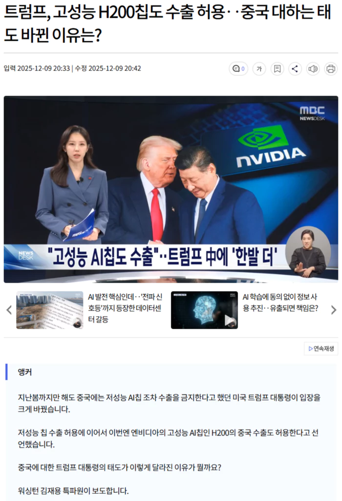 트럼프 대통령은 엔비디아의 인공지능칩인 H200의 대중국 수출을 허용한다고 SNS에서 밝혔습니다.