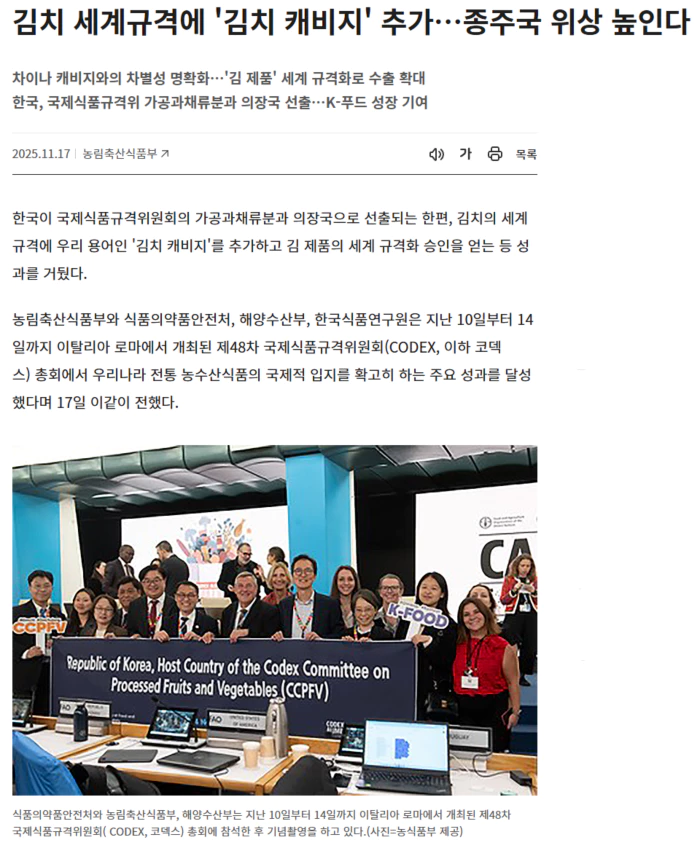 먼저, 우리나라가 코텍스 채류분과 의장국으로 선출되고 식약처가 의장으로 활동하게 됨에 따라 향후 김치, 인삼제품, 고추장 등 우리 식품의 세계 규격 운영을 주도할 수 있게 됐다. 아울러 아시아 지역에서 많이 소비되는 고구마, 밤, 감(홍시 포함) 제품 등의 국제기준 설정도 적극적으로 추진할 수 있는 계기를 마련했다. 이번 의장국으로 선출된 것은 그동안 우리나라가 코덱스의 항생제내성특별위원회 의장국, 아시아지역조정위원회 의장국, 식품첨가물분과위원회 공동의장국 역할을 성공적으로 수행하면서 보인 식품안전분야 국제협력을 위한 다양한 노력과 글로벌 리더십이 국제사회로부터 높이 평가받고 있음을 보여주는 성과다. 이를 통해 해외 식품기술규제에 더욱 효과적으로 대응하고 K-푸드 산업 성장과 수출 시장 확보에 기여할 것으로 기대된다. 또 우리나라가 제안해 2001년 세계규격으로 제정된 김치의 주원료인 배추 명칭에 기존 'Chinese cabbage'(차이나 캐비지)에 'kimchi cabbage'(김치 캐비지)와 'Napa cabbage'(나파 캐비지)를 추가로 등재했다. 이는 우리나라가 김치 종주국으로서 과학 문헌, 교역 관행에서 'kimchi cabbage'와 'napa cabbage'의 사용이 증가하고 있는 점을 확인해 주도적으로 국제식품규격 수정 작업에 노력한 성과다. 이를 통해 김치 종주국으로 위상을 공고히 하고, 전통식품인 국내산 김치의 고유성과 차별성을 높여 김치의 브랜드화와 수출 활성화에 기여할 것으로 기대된다. 이와 함께 기존에 아시아 지역규격으로만 등재돼 있던 '김 제품'에 대해 세계 규격화를 위한 신규 작업 개시가 승인됐다. 이는 우리나라가 김을 세계 규격으로 제정할 것을 강력하게 제안하고 코덱스 회원국의 지지를 얻어낸 결과다. 이를 통해 전 세계적인 김 소비 증가 추세에 맞춰 우리나라가 주도적으로 고품질의 국제 표준을 마련할 수 있는 기반을 확보하게 됐고, K-씨푸드 대표 주자로 김의 국제적 위상을 격상시킬 수 있게 됐다. 김의 품질, 위생, 표시, 시험법 등에 대한 국제적인 통일 기준이 마련되면 고부가가치 수산식품인 김 산업의 지속가능한 성장에 중요한 발판이 돼 세계 시장에서 한국산 김의 신뢰도와 경쟁력이 더욱 높아질 것으로 기대된다. 특히 수출 대상국의 개별적인 요구사항에 일일이 대응할 필요가 줄어들어 연간 10억 달러 이상을 목표로 하는 김 수출 확대에 기여할 것으로 예상된다. .. 후략 ..