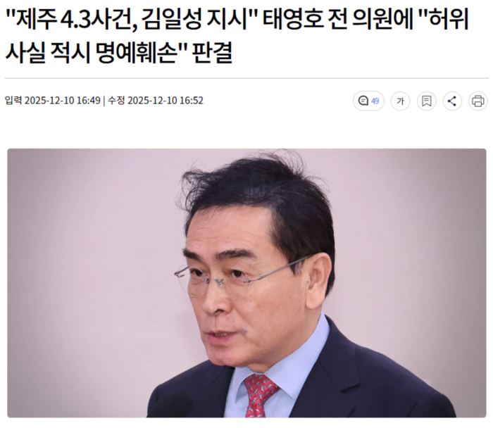 오 판사는 태 전 의원의 발언은 4.3 진상조사보고서 등을 볼 때 허위사실로 봄이 타당하며, 4.3 유족회의 명예를 훼손해 손해배상책임이 있다고 밝혔습니다.