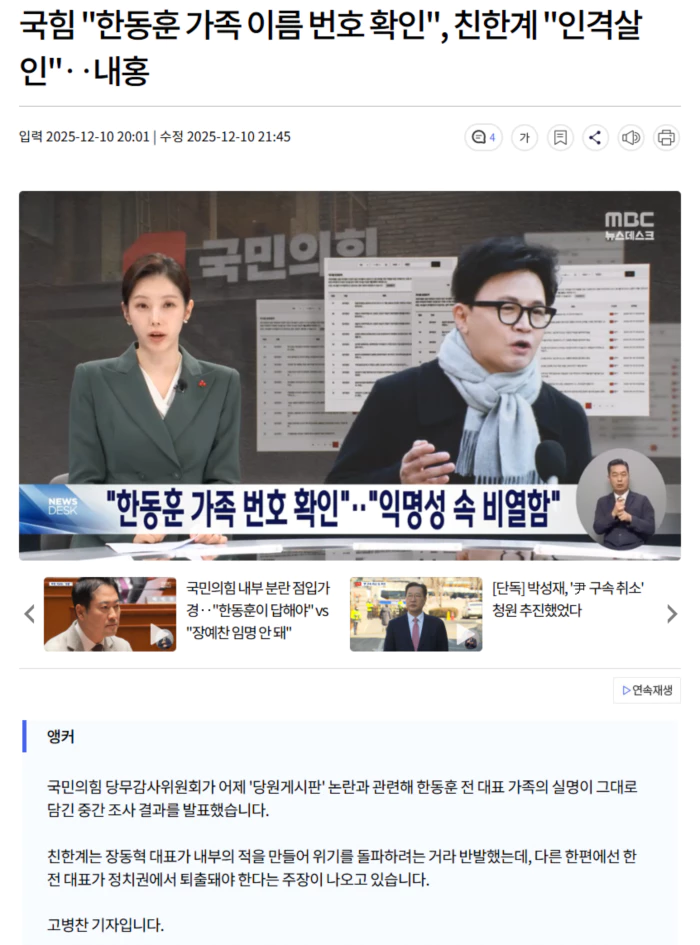 당원게시판에 윤석열 전 대통령 부부 비방 글을 쓴 작성자를 아직 '확인 중'이라면서도, 한 전 대표 가족이 작성자로 이해될 만한 사실관계를 최종 결과 발표 전에 공개한 겁니다.