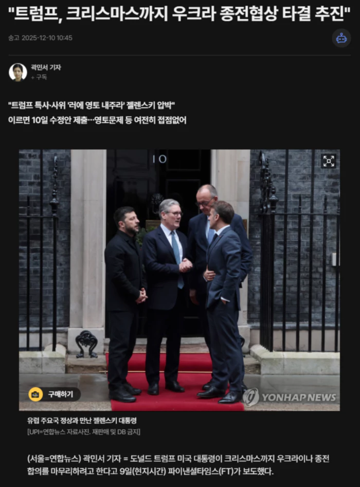 보도에 따르면 미국은 최근 우크라이나에 사실상 며칠에 불과한 시한을 제시하고, 러시아가 요구하는 동부 돈바스 영토를 포기하도록 압박하고 있다. 미국은 그 대가로 우크라이나에 안전보장을 약속하겠다는 입장이지만, 구체적인 내용은 명확히 정해지지 않은 상태다. 협상 내용에 정통한 한 관계자는 "트럼프 대통령이 크리스마스까지 (종전) 합의가 이뤄지길 바라고 있다"고 FT에 말했다. 볼로디미르 젤렌스키 우크라이나 대통령은 지난 6일 트럼프 대통령의 특사 스티브 윗코프, 트럼프 대통령이 사위 재러드 쿠슈너와의 두 시간 전화통화에서 빠른 결단을 내리라는 압박을 받았다고 유럽 정상들에게 털어놓았다. 젤렌스키 대통령은 유럽 동맹들과 논의할 시간이 필요하다고 맞선 것으로 전해진다. 그는 지난 8일 왓츠앱에서 진행한 언론 브리핑에서 "솔직히 말해, 미국은 바로 오늘 합의(타협)를 원하고 있다"고 말했다. 특히 그는 우크라이나 동부 영토를 양보하라는 러시아의 요구를 받아들이라고 미국이 압박하고 있다고 털어놓았다. 당초 미국이 주도해 마련한 종전안은 러시아에 지나치게 유리한 것으로 평가되면서 우크라이나와 유럽 국가들의 반발을 샀다. 당시 28개 종전안에는 우크라이나의 군대 규모를 60만명으로 제한하고, 우크라이나의 북대서양조약기구(NATO·나토) 비가입을 헌법에 명기하며, 우크라이나 동부 지역 돈바스 영토를 포기해야 한다는 내용 등이 들어 있었다. 이후 우크라이나는 미국과 추가 협의를 거쳐 28개 종전안을 20개 항목으로 줄이는 성과를 냈고, 이어진 유럽 주요국과의 협의에서도 세부 항목 논의에서 상당 부분 진전을 이뤘다. 우크라이나는 이러한 논의 내용을 바탕으로 미국에 이르면 10일 수정 협상안을 제시하겠다는 방침이다. 그러나 양측은 돈바스 영토 포기 문제에서 이견을 좁히지 못하고 있다. .. 후략 ..