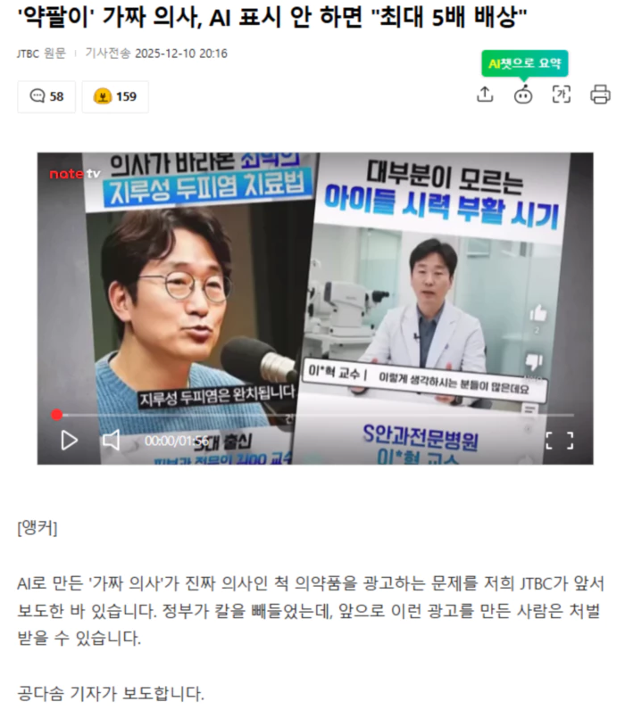 [기자] 안과 전문병원 교수라는 남성이 영양제를 추천합니다. [전문가 관점에서 제가 실제로 부모님들께 가장 많이 권하는 제품이 OOOO입니다.] 피부과 전문의라는 사람도 마찬가지. [딱 3개월, 3개월만 드셔보세요.] 의사처럼 보이지만 모두 AI로 만든 가짜 의사입니다. 실제 의사가 식의약품을 광고하는 건 불법이지만 AI 생성물은 법 적용을 받지 않는 걸 악용한 겁니다. 확인되지 않은 의학 정보도 넘쳐나고 있습니다. [환자 중 한 분은 관상동맥이 70% 막혔던 상태에서 단 6개월 만에 정상으로 돌아왔어요. 비결이 뭐냐고요? 마트 식품 2가지를 꾸준히…] 실제 소셜미디어로 빠르게 퍼진 허위 정보로 노년층 등 피해가 늘자 정부가 결국 칼을 빼들었습니다. 앞으론 AI로 만든 가상의 인물이 제품을 추천할 경우 '가상 인간'이라는 점을 반드시 표시해야 하고, AI로 만든 의사 등 전문가가 식의약품을 추천하는 광고는 AI 생성물이더라도 처벌이 가능해집니다. 처벌도 강해집니다. 손해액의 최대 5배까지 배상하도록 하고, AI 광고가 며칠 만에 삭제되는 점을 고려해 대응 속도도 높이기로 했습니다. .. 후략 ..