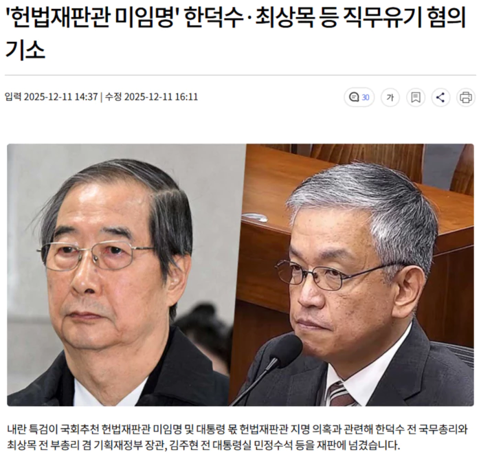 특검은 한 전 총리와 최 전 부총리를 윤 전 대통령의 탄핵 소추 이후 국면에서 국회가 추천한 헌법재판관 후보자를 임명하지 않은 직무유기 혐의로 불구속기소 했습니다.