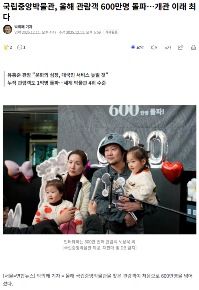 국립중앙박물관은 11일 오후 2시께 연간 누적 관람객이 600만명을 돌파했다고 밝혔다. 2005년 용산으로 이전해 관람객 약 134만명을 기록한 이후 20년 만에 약 4.5배 증가한 규모다. 1945년 12월 3일 박물관(당시 국립박물관) 개관 이후 80년간 누적 관람객은 1억84만8천118명으로 1억명을 넘어섰다. 미술 전문 매체 '아트 뉴스페이퍼'가 발표한 2024년 세계박물관 관람객 조사 기준으로는 루브르박물관(873만7천50명), 바티칸박물관(682만5천436명), 영국박물관(647만9천952명)에 이어 세계 4위에 해당한다 600만 번째 관람객이 된 행운의 주인공은 성남시 분당구 판교동에서 온 노용욱(40세) 씨다. 쌍둥이 자녀와 함께 가족 4명이 방문해 뜻깊은 순간을 맞았다. 노씨는 "특별전 '인상주의에서 초기 모더니즘까지'와 어린이박물관을 보기 위해 박물관에 처음 방문했다"며 "어린이박물관을 아이들이 좋아한다는 이야기를 듣고 왔는데 600만 번째 관람객이 돼 기쁘다"고 말했다. 유홍준 국립중앙박물관장은 노 씨에게 직접 선물을 전달했다. 600만 명 돌파 이후 첫 외국인 관람객에게도 선물이 전달됐다. 덴마크에서 온 레서(Lasse) 씨는 "덴마크 인구가 약 600만 명인데 한국에서 600만명이 박물관을 찾았다니 놀랍다"며 "아내가 한국인이어서 한국 문화를 이해하고 싶어 함께 방문했고, 특별전 '우리들의 이순신'을 기대하고 왔다"고 했다. 국립중앙박물관과 전국 13개 소속박물관의 올해 누적 관람객 수는 총 1천380만3천717명으로 집계됐다. 이는 2025년 프로야구 연간 관중 수(1천264만7천599명)를 넘어서는 규모다. 국립중앙박물관은 "박물관이 더 이상 특정 관심층의 공간이 아니라 전 국민이 일상에서 즐기러 가는 곳이 됐음을 보여주는 의미 있는 변화"라고 평가했다. 관람객 증가 요인에 대해 국립중앙박물관은 학술연구 성과와 디지털 신기술을 반영한 전시 혁신으로 꼽았다. '사유의 방', '외규장각 의궤실' 등 한 가지 주제를 심화한 상설전시 개편과 '새 나라 새 미술: 조선 전기 미술 대전'과 같은 학술 기반 특별전이 전통문화의 가치를 새롭게 전달했다는 분석이다. .. 후략 ..